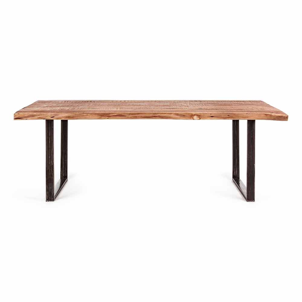 Matbord i industriell stil med akaciaträplatta och stålbotten.