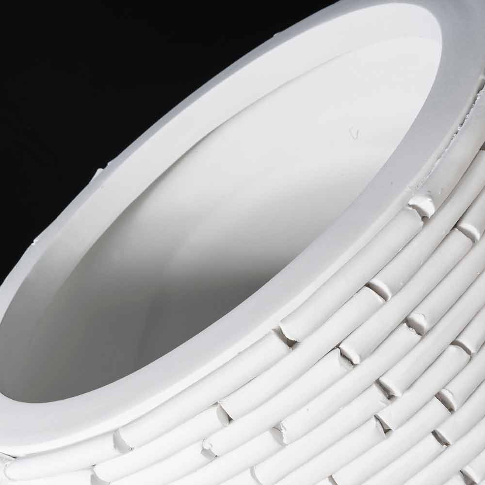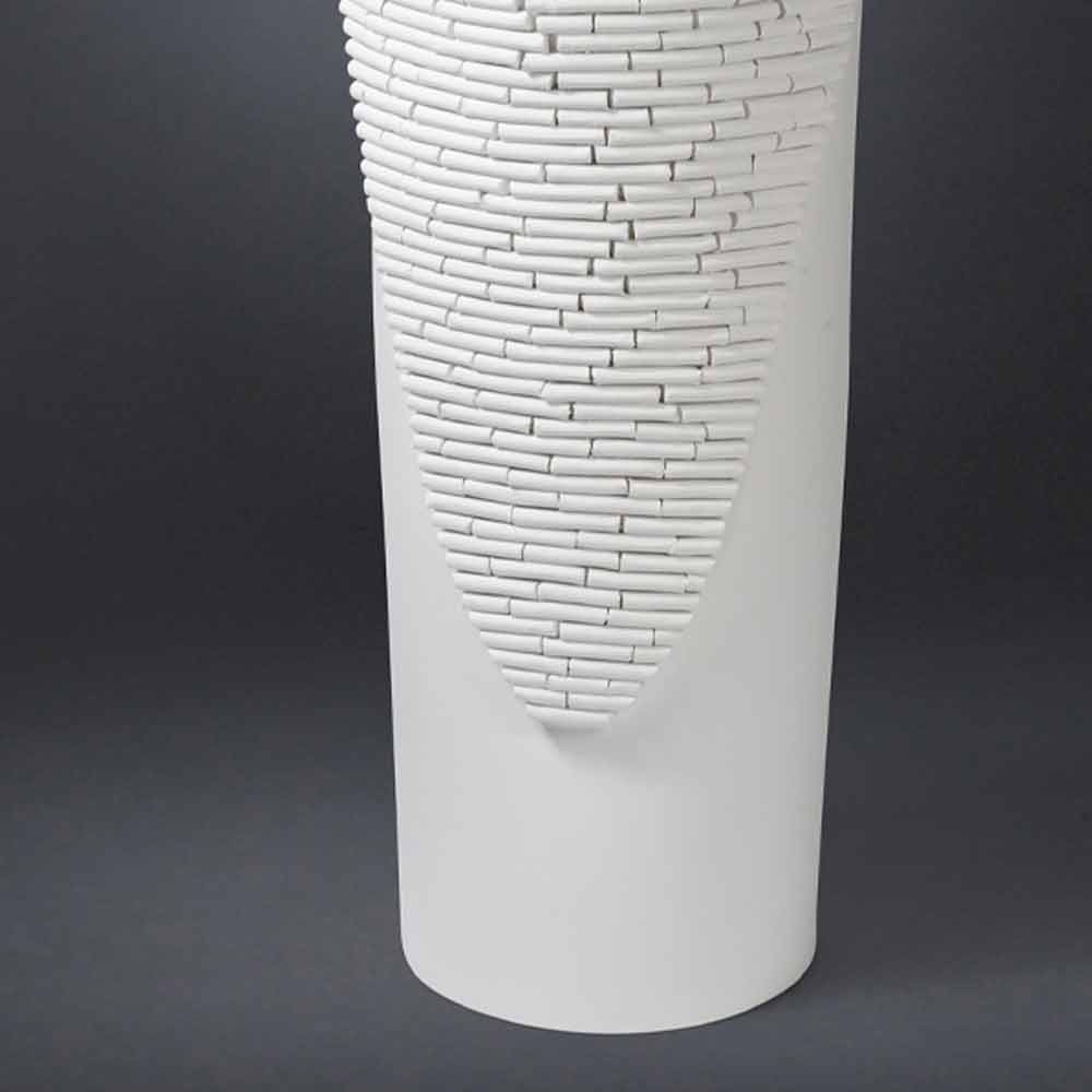 Hög vas för interiörer i matt vit keramik handgjord i Italien. Användningen av keramik och hantverk tillsammans med den speciella bearbetningen som täcker en del av vasens struktur, representerar de egenskaper som gör den till ett exklusivt och förfinat dekorativt element, ökar dess värde och betonar dess kvalitet. Resultatet är ett elegant och särskilt mångsidigt komplement som kan anpassas till alla stilistiska situationer på bästa möjliga sätt. En idealisk estetik för de mest varierade miljöerna, från heminredning till hotell, restauranger, kontraktsområden, spa men också som en miljö för evenemang och bröllop.