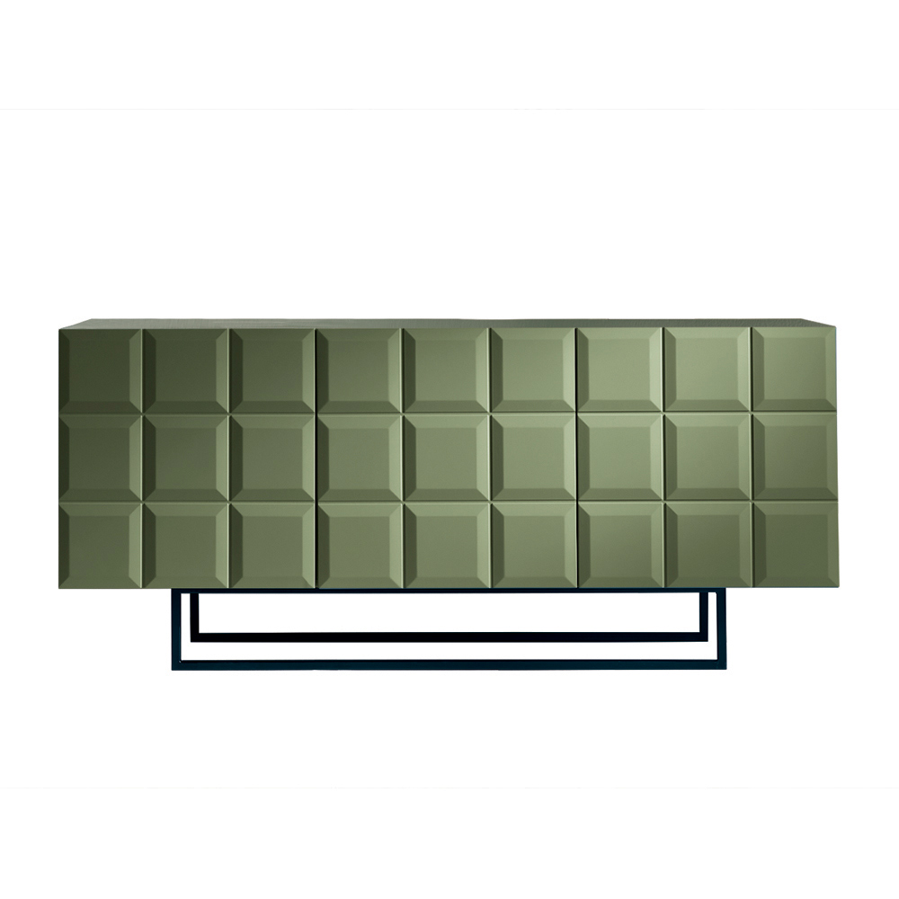 Den melaminbelagda stommen kombineras med en lackerad metallbas , som finns i olika konfigurationer, vilket effektiviserar strukturen och ger en visuell lätthet. Skänken kan kompletteras med en spegelglasskiva för en ännu mer sofistikerad effekt.