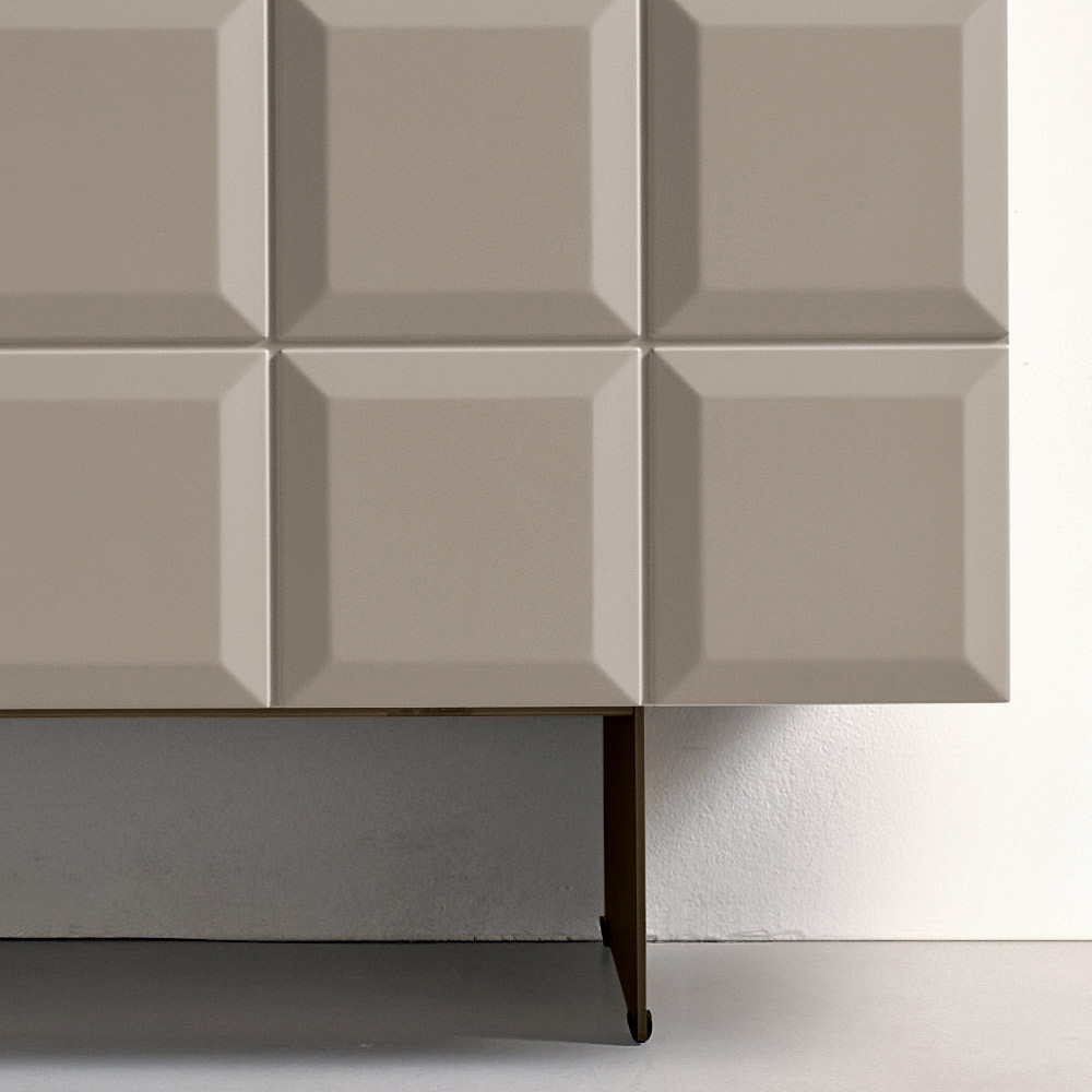 Den melaminbelagda stommen kombineras med en lackerad metallbas , som finns i olika konfigurationer, vilket effektiviserar strukturen och ger en visuell lätthet. Skänken kan kompletteras med en spegelglasskiva för en ännu mer sofistikerad effekt.