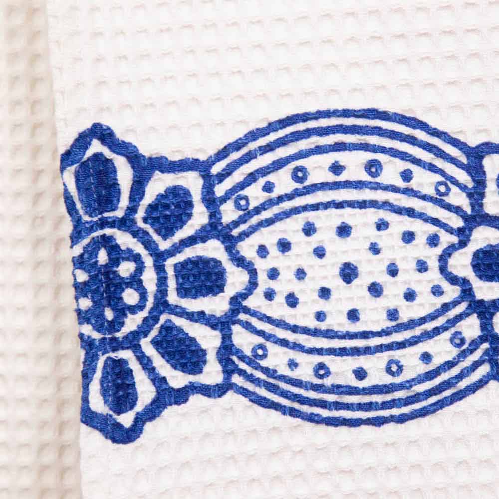 Badhandduk i vit färg av högt italiensk hantverk i ren bikakebomull tryckt för hand med antikblå ritning av en prydnadsfries från artonhundratalet, unikt i världen.