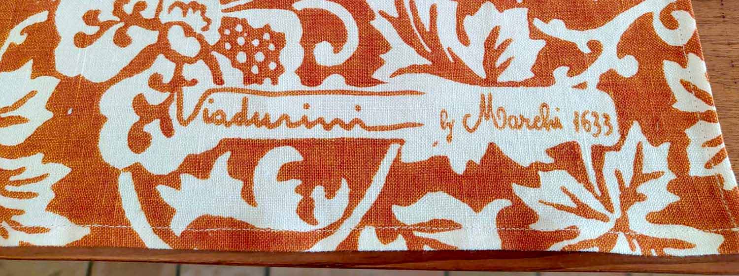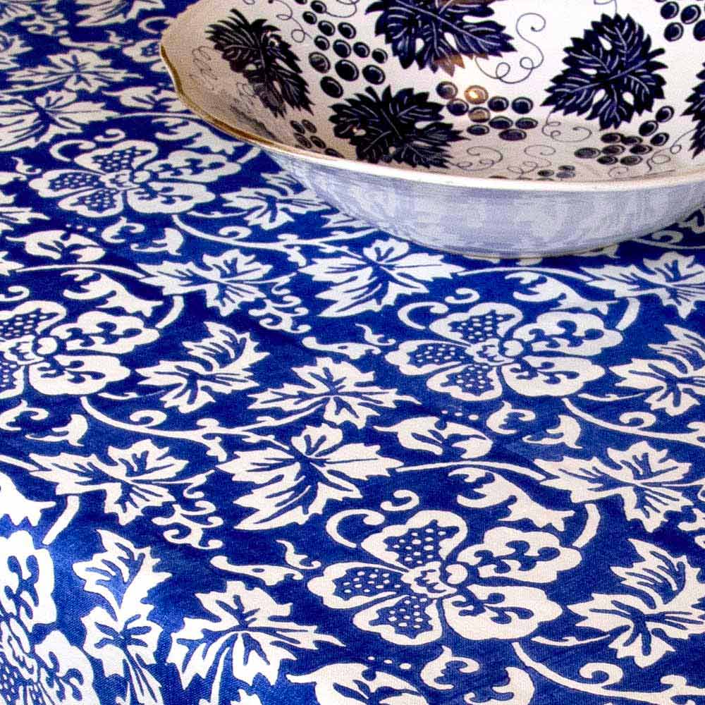 Italiensk bordsduk av hög kvalitet i rent linne, helt handtryckt i blått eller rost med träformar med en konstnärlig design av ett rosfönster, ett unikt och kvalitetsstycke tillverkat i Italien.