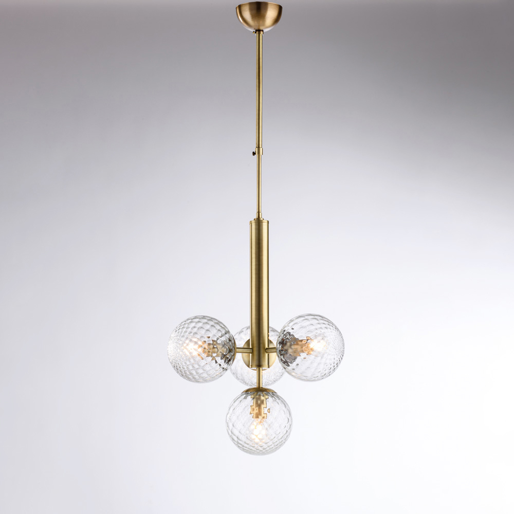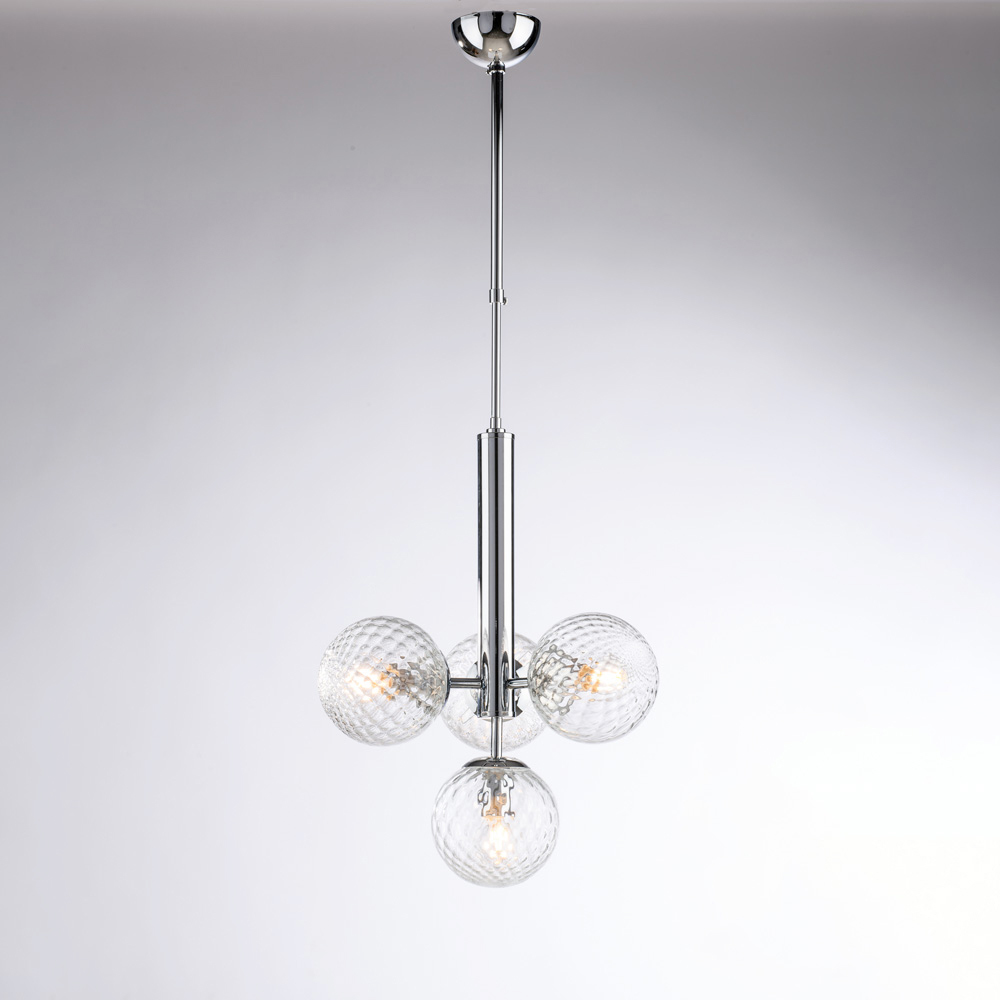 Denna eleganta och moderna pendellampa i järn utmärker sig med sin balanserade och raffinerade design. Den centrala vertikala strukturen stöder fyra sfäriska glasdiffusorer , vilket skapar en harmonisk ljuskomposition som sprider ljuset jämnt och omslutande.