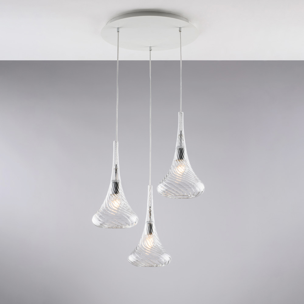 Lätt och elegant, denna handgjorda järnpendel med Pyrex-glas är en belysningslösning med en raffinerad och modern design. De tre Pyrex-glasdiffusorerna , med sina mjuka och slingrande former, är upphängda individuellt, vilket skapar en behaglig dynamisk effekt och en harmonisk och omslutande ljusspridning.
