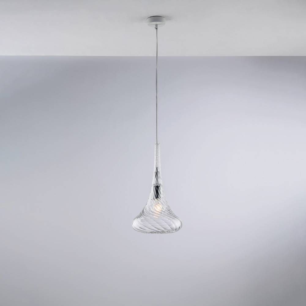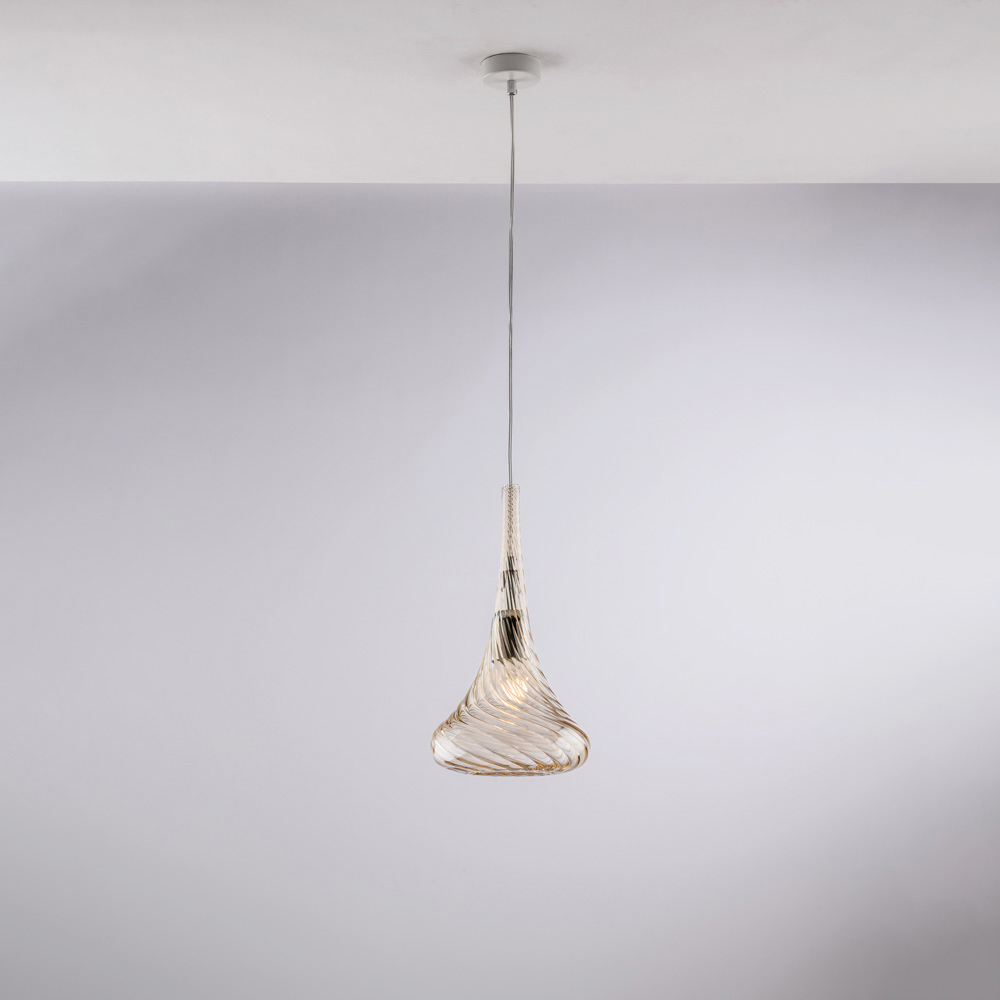 Denna pendellampa finns i transparent , bärnstensfärgad eller grå finish och anpassar sig enkelt till en mängd olika inredningssammanhang: ljus och minimalistisk i den transparenta versionen, varm och omslutande i bärnstensfärgad, diskret och elegant i grått. Den är idealisk för kök , köksöar , matbord , hallar , läshörnor och designade kontorsutrymmen , oavsett om den används individuellt eller i kompositioner.