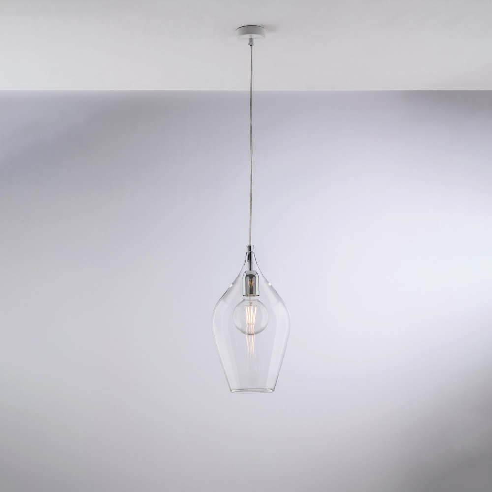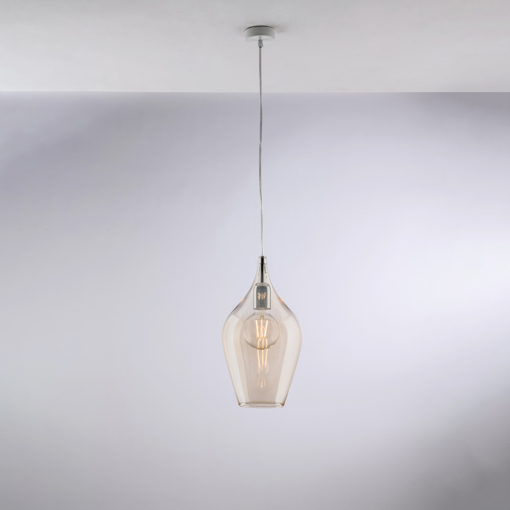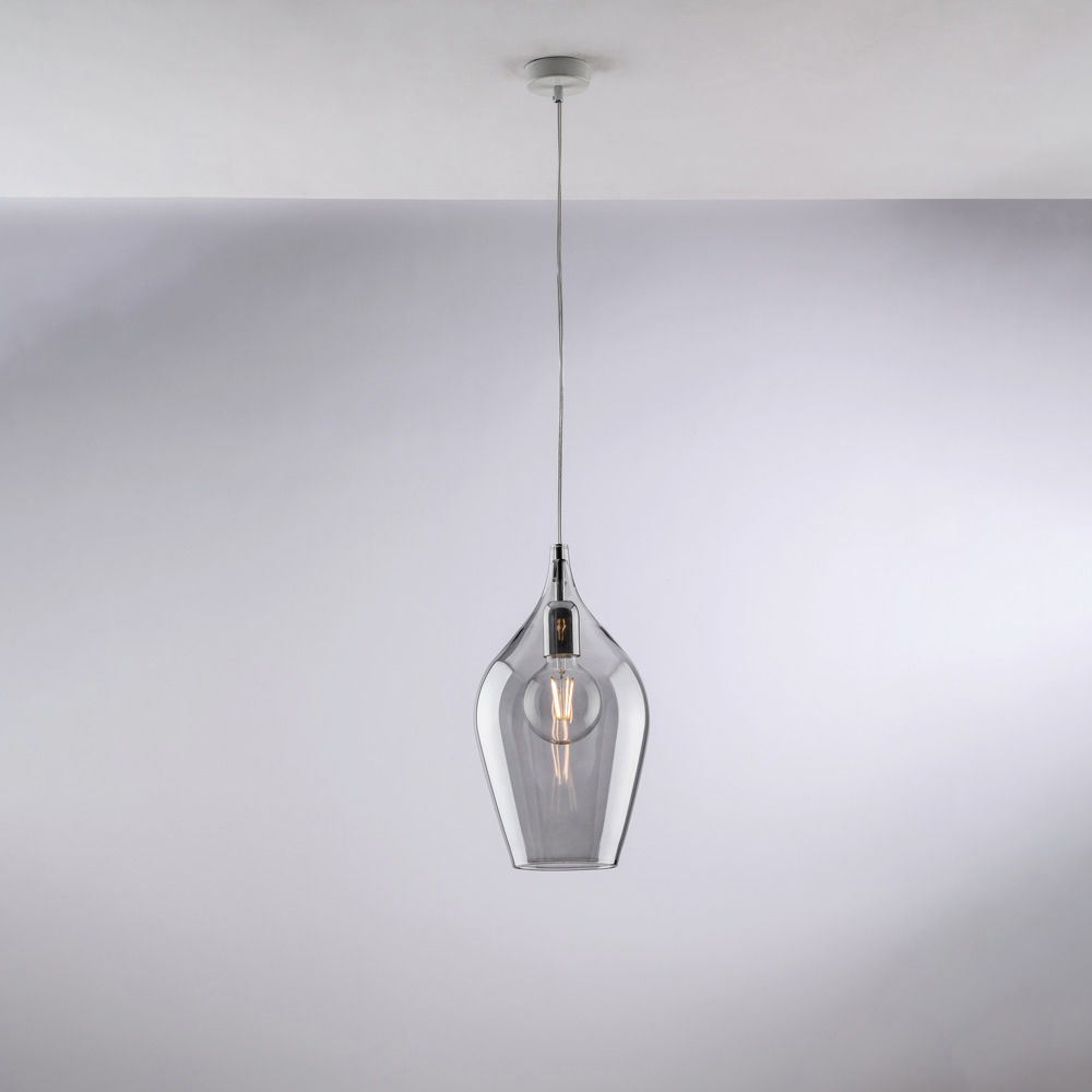 Denna pendellampa finns i transparent , bärnstensfärgad eller grå finish och passar en mängd olika inredningsstilar: ljus och minimalistisk i den transparenta versionen, varm och omslutande i bärnstensfärgad, elegant och modern i grå. Den är idealisk för kök , köksöar , matbord , hallar , läshörnor och designade kontorsutrymmen , antingen individuellt eller i kompositioner.