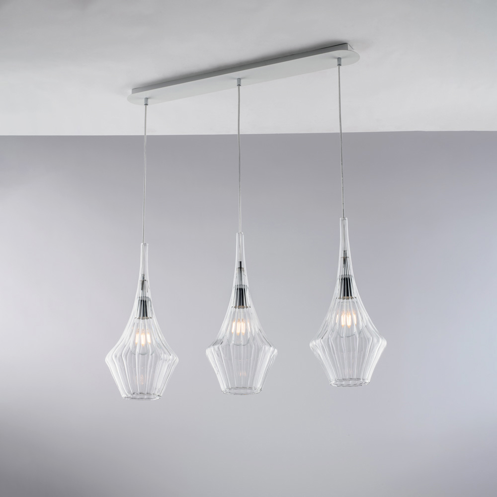 Denna handgjorda pendellampa i järn med Pyrex-glas är strömlinjeformad och elegant, och är en modern belysningslösning utformad för att förhöja utrymmen med balans och förfining. De tre Pyrex-glasdiffusorerna , med sina fasetterade och harmoniska former, sprider ljuset jämnt och skapar en lysande och sofistikerad atmosfär.