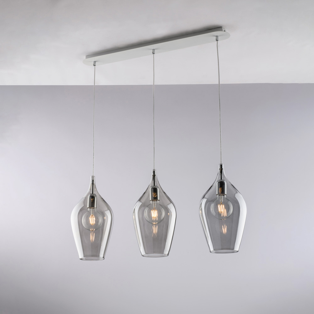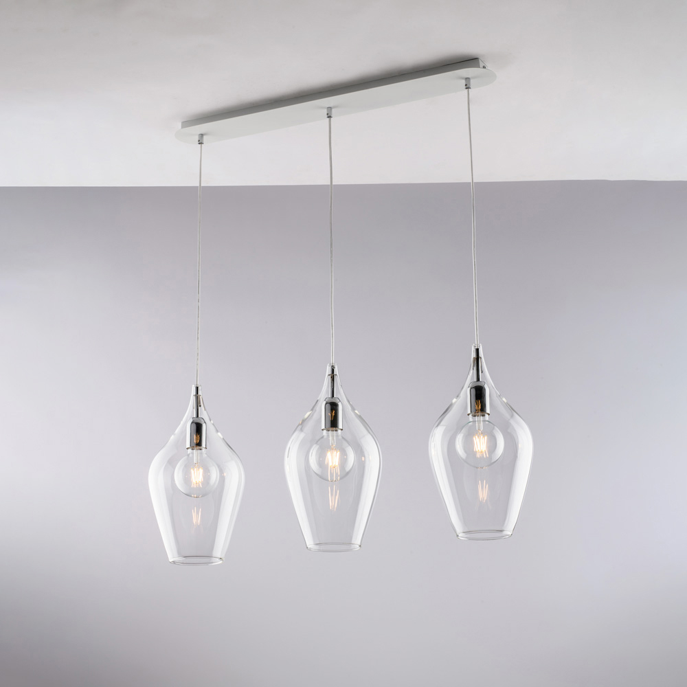 Denna pendellampa finns i transparent , bärnstensfärgad eller grå finish och låter dig anpassa atmosfären i ditt utrymme: ljus och minimalistisk i den transparenta versionen, varm och omslutande i bärnstensfärgad, diskret och sofistikerad i grått. Den är perfekt för köksöar , matbord , bänkskivor , öppna utrymmen och designade kontorsmiljöer .