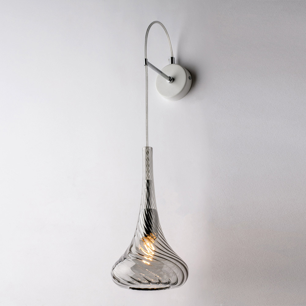Denna eleganta och lätta handgjorda vägglampa i järn med Pyrex-glas är en modern belysningslösning, utformad för att förhöja dina väggar med en subtil stil. Den slingrande och delikat utformade pendellampan i Pyrex-glas skapar en raffinerad visuell effekt och sprider ett mjukt, välkomnande ljus.