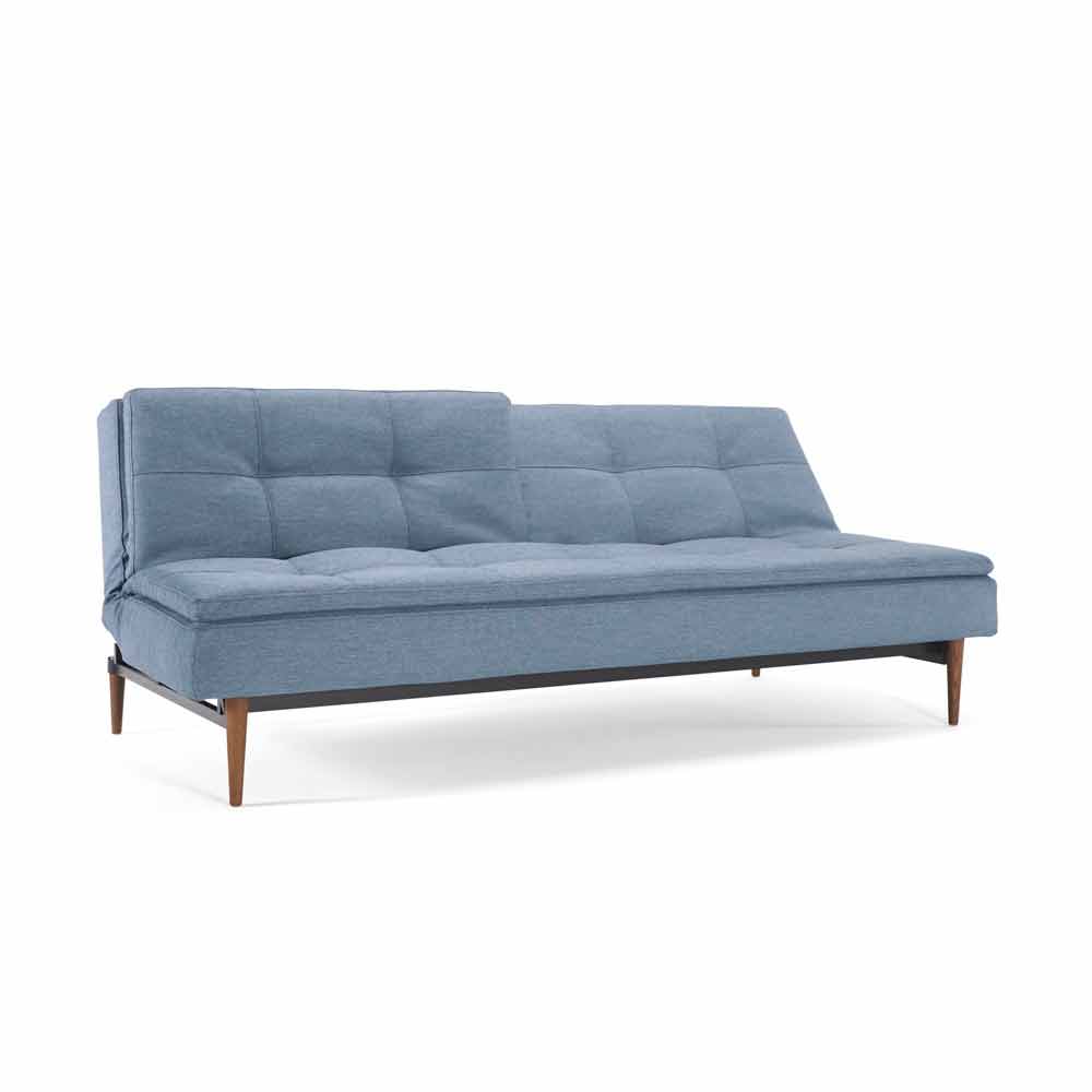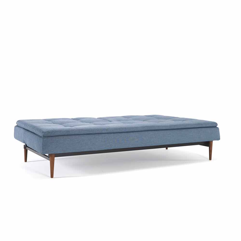 Blå bäddsoffa med skandinavisk design justerbar i 3 lägen Dublexo från Innovation, fötter i mörkt trä, matt svart struktur.