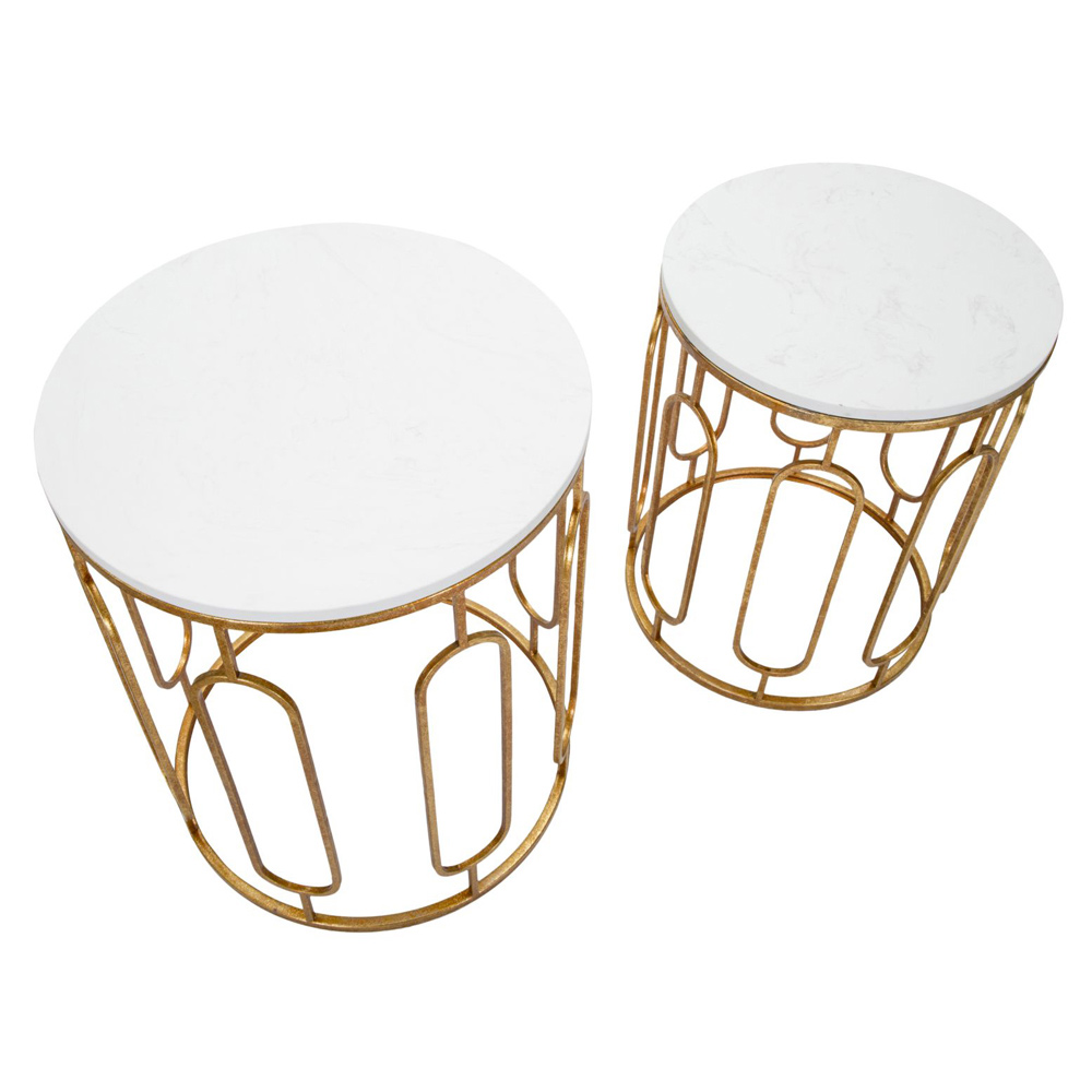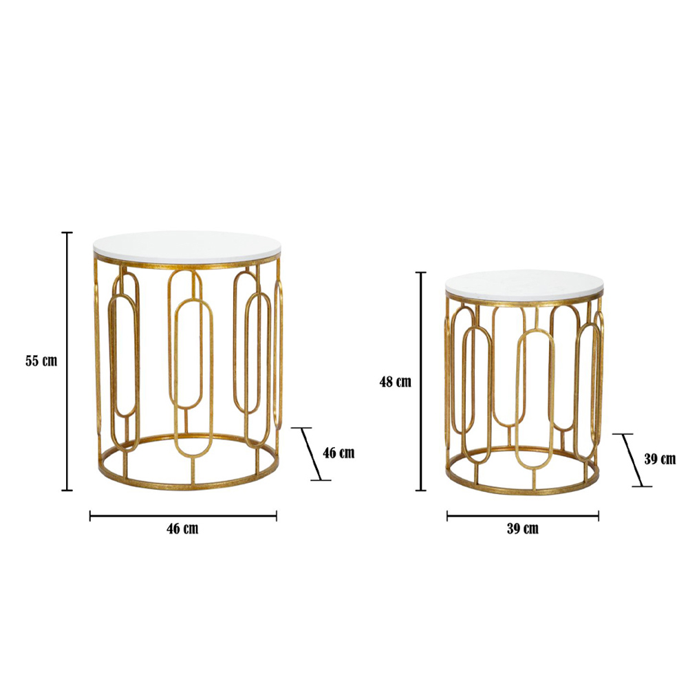 Ett par soffbord med järnstruktur i gyllene finish och rund topp i