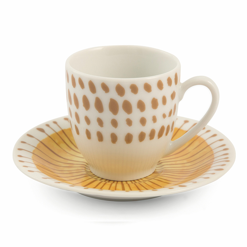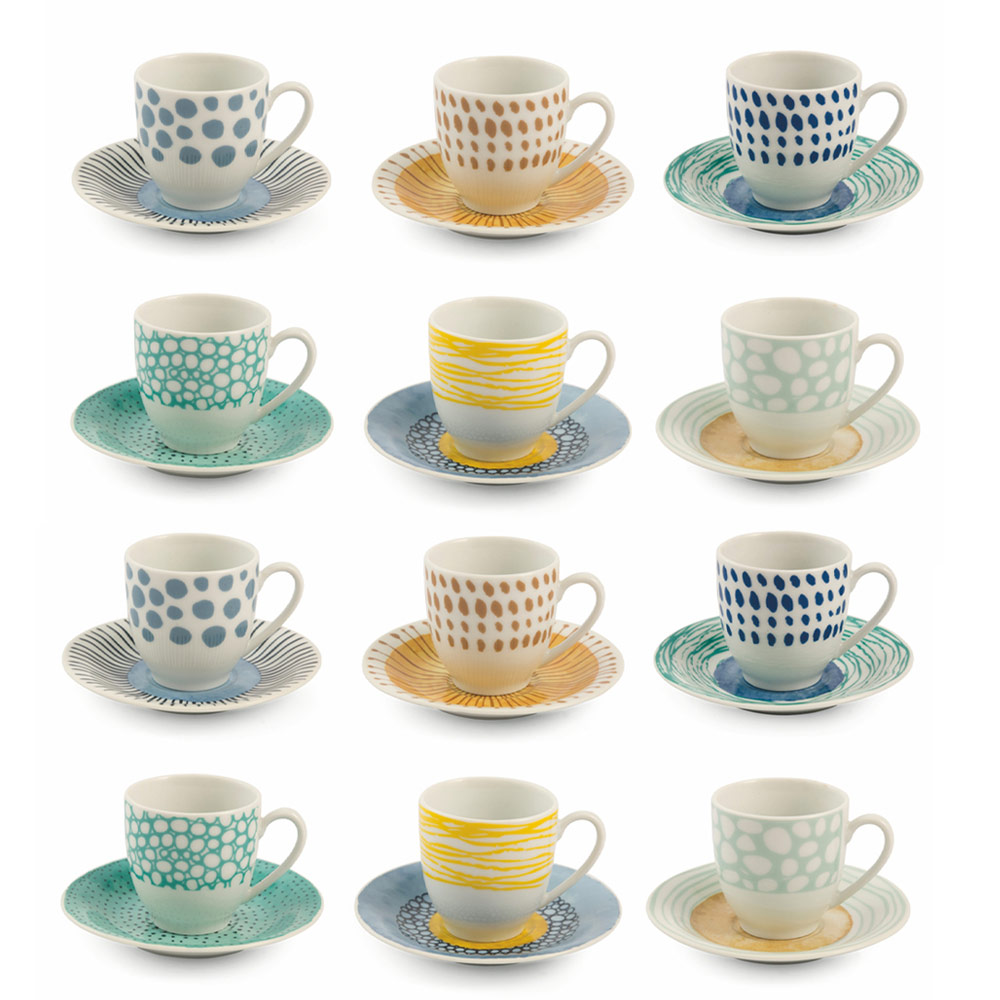 Kaffekoppsset i färgat porslin med dekorationer och fat, 12 st.