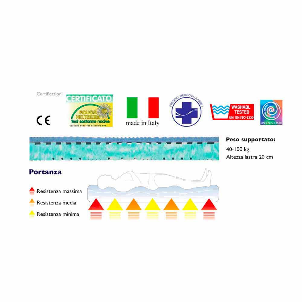 Av denna anledning rekommenderar vi användningen av denna madrass, certifierad som en klass I medicinteknisk produkt , i kombination med ett specialdesignat överdrag med integrerat topphölje.