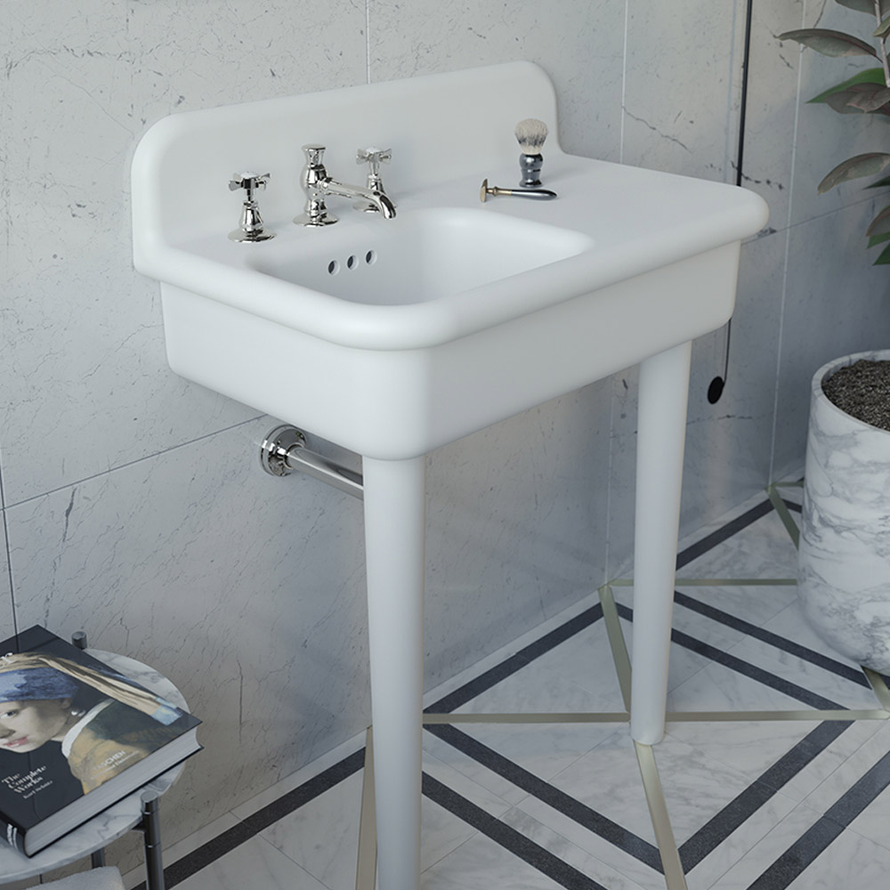 2 vita keramiska ben som tvättstället vilar på.