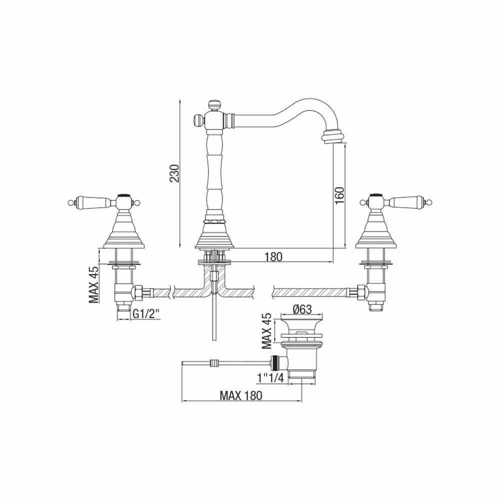 Klassisk design mässing 3-håls tvättställsblandare Tillverkad i Italien.