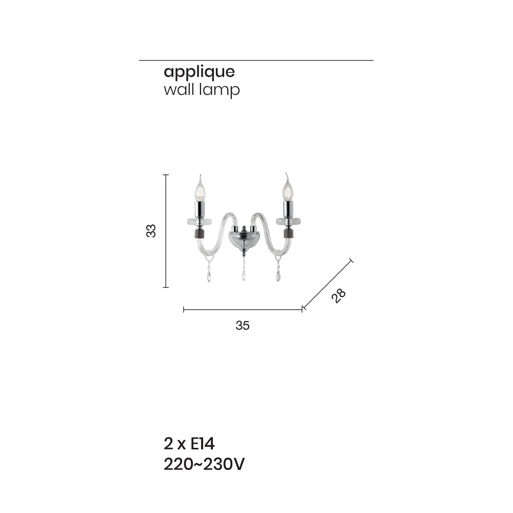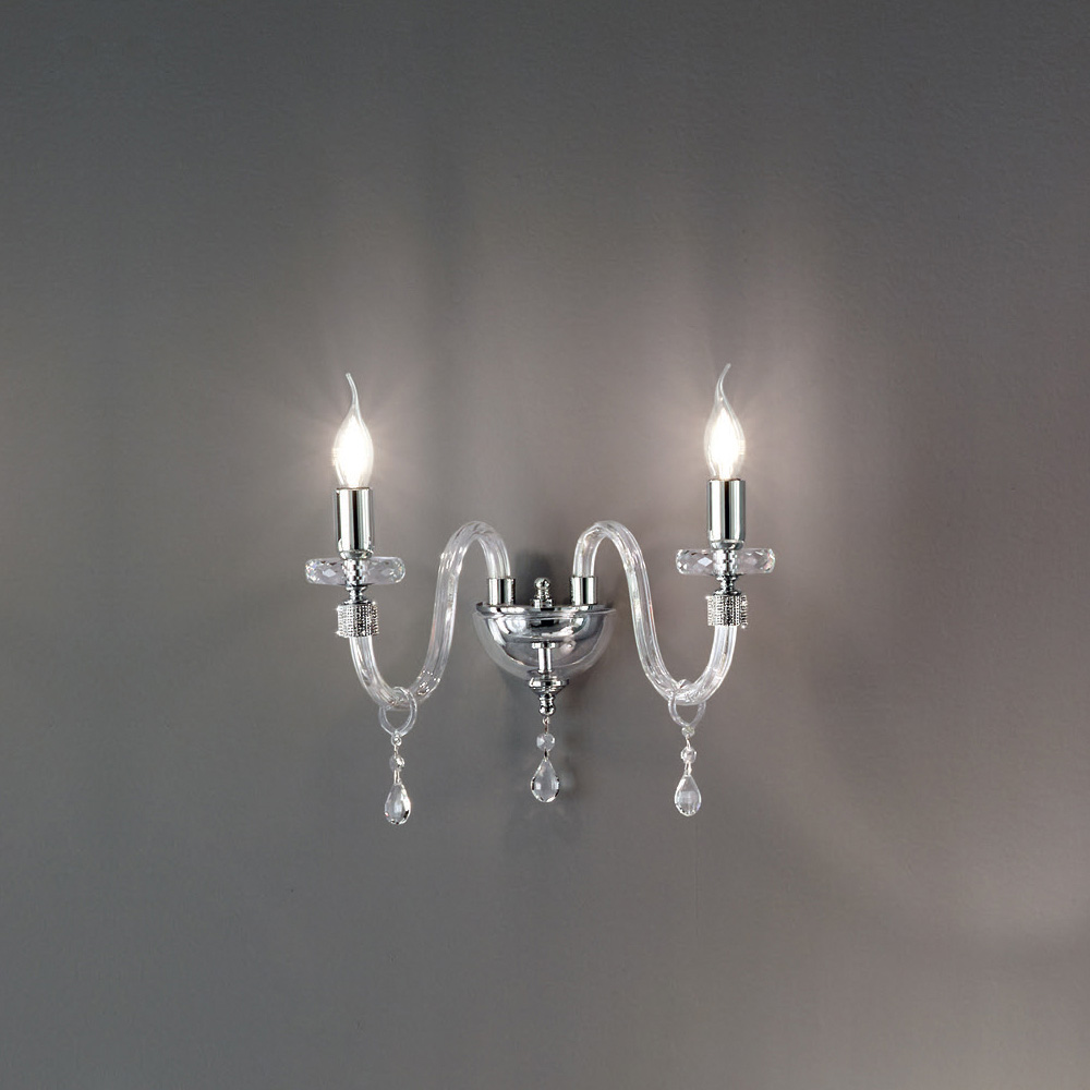 Denna vägglampa i klassisk stil består av 2 välvda armar gjorda av transparent glas handgjorda i Italien med en "rigaton"-effekt, vars ändar är omgivna av glitter i metallen, samt för den centrala delen av komplementet, där två rör cirkulära skivor stödjer strukturen varvat med två cirkulära skivor av olika storlekar gjorda av skuren kristall.