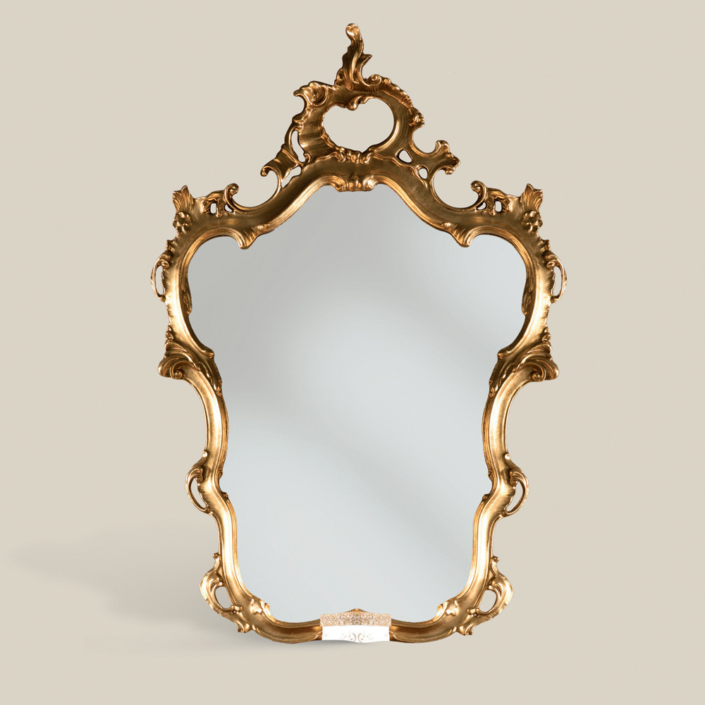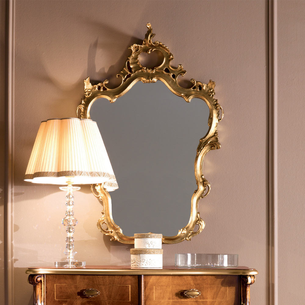 Spegel i klassisk stil med formad ram avslutad med bladguld , perfekt för att dekorera alla miljöer med personlighet och originalitet. Ett unikt och raffinerat komplement, helt tillverkat i Italien av skickliga hantverksmästare , konstmästare som avslutar varje komplement med visdom och smak för elegans. Produktionen utförs med fina material och utför arbetet för hand med största omsorg och professionalism som utmärker Made in Italy -produkter.
