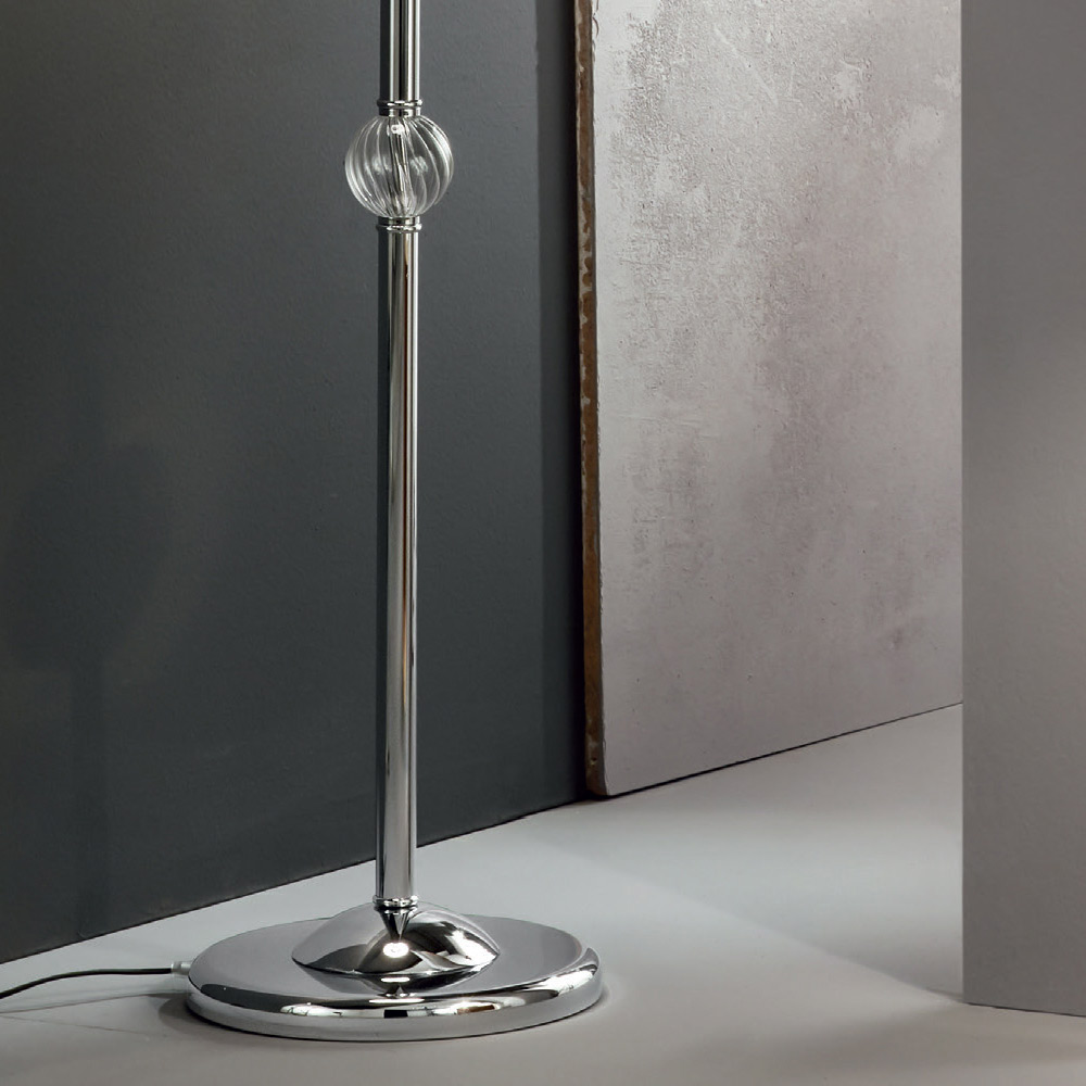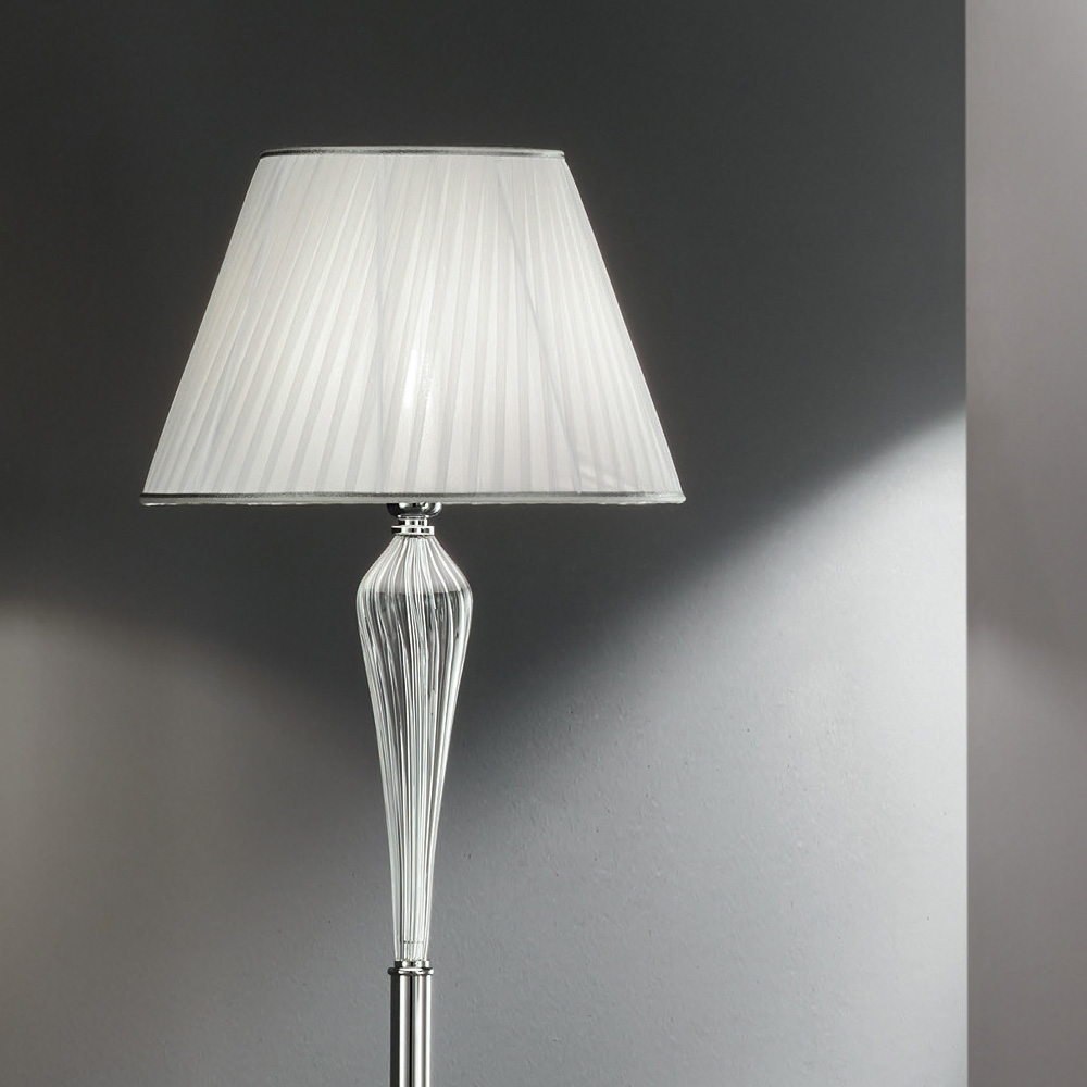 Den säregna egenskapen ges av de dyrbara motiven tillverkade i glas handgjorda i Italien med en "rigaton"-effekt som avslöjar metallkärnan och som stödjer lampskärmen i vitt veckat tyg .