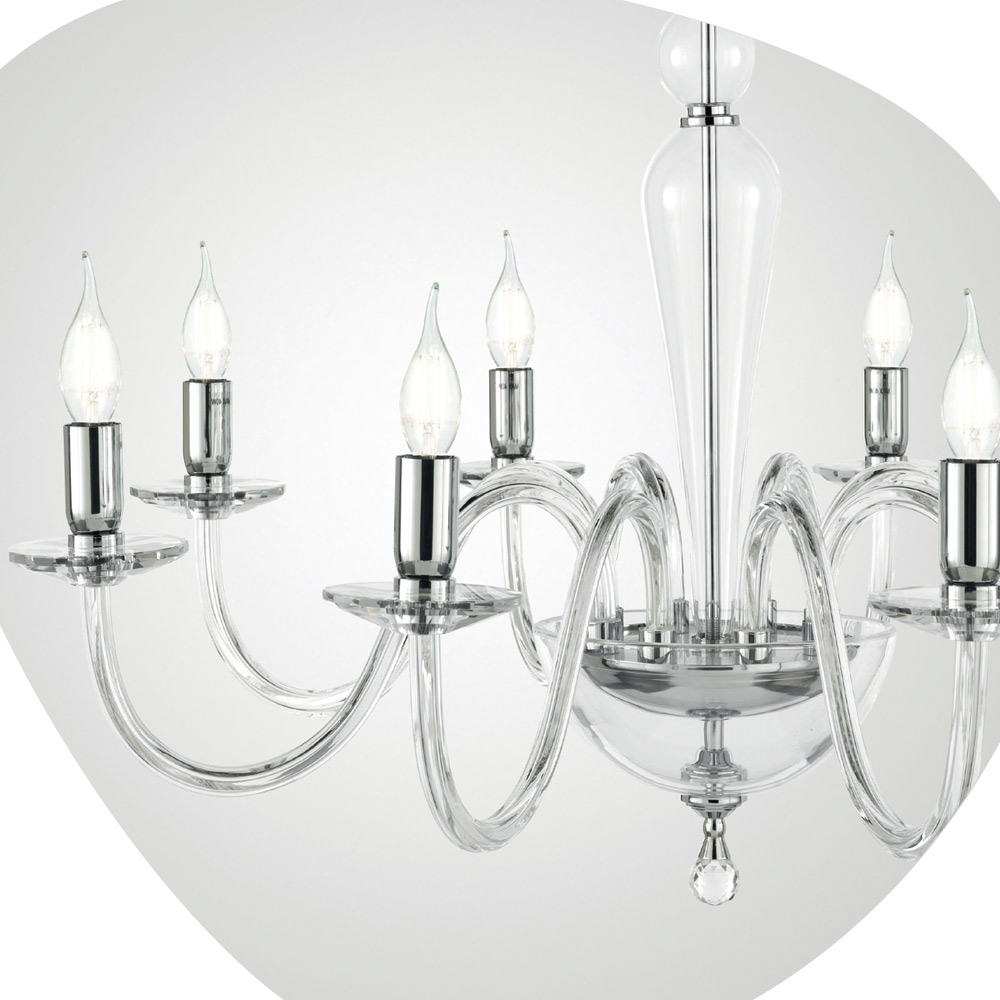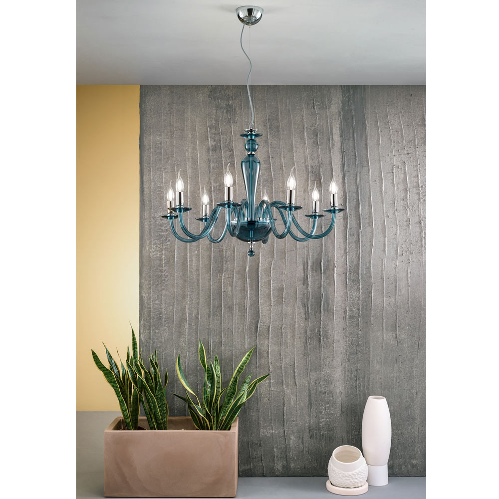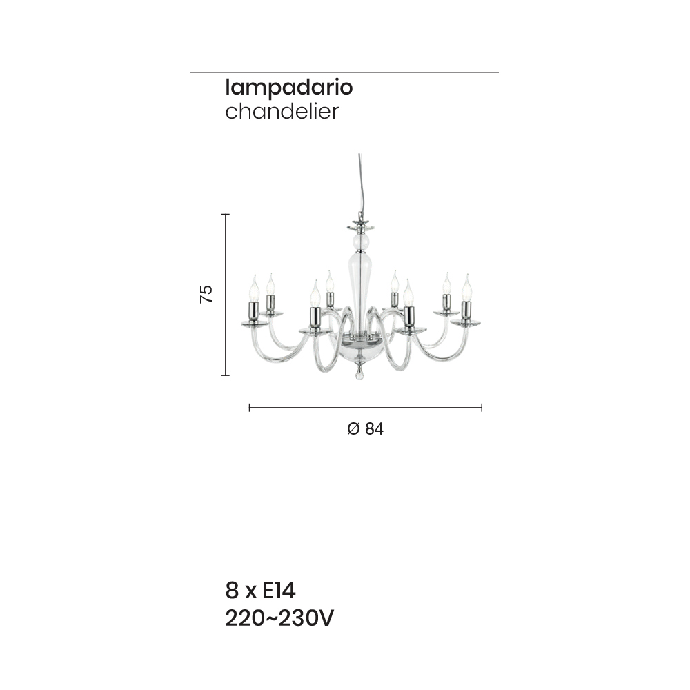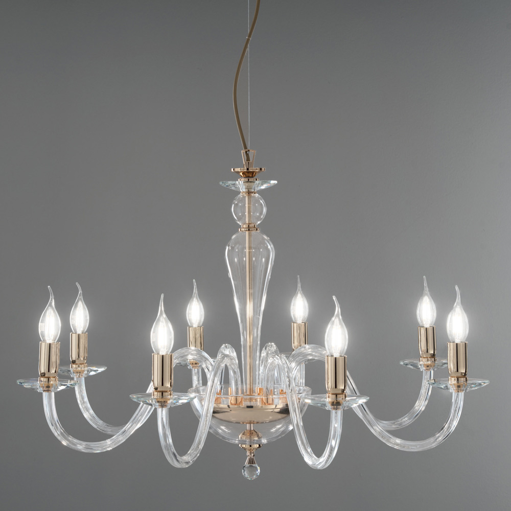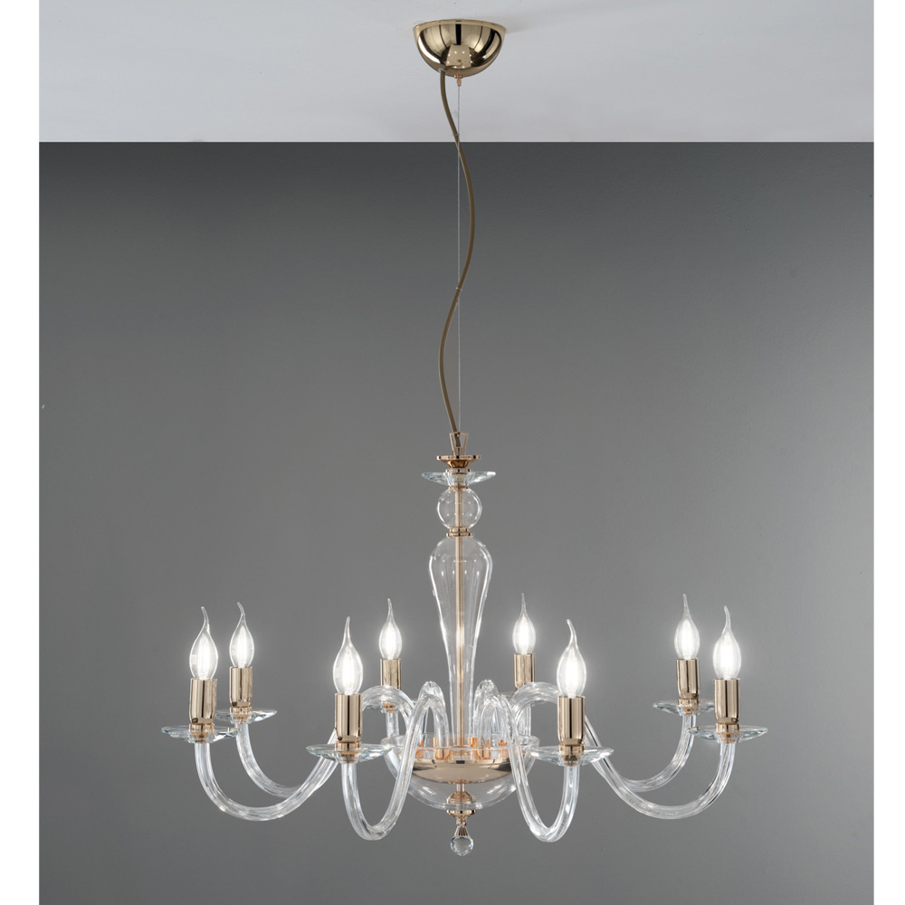 Denna hängande ljuskrona i klassisk stil består av 8 välvda armar gjorda av glas handgjorda i Italien som stödjer faten som är värd för ljuskällorna.