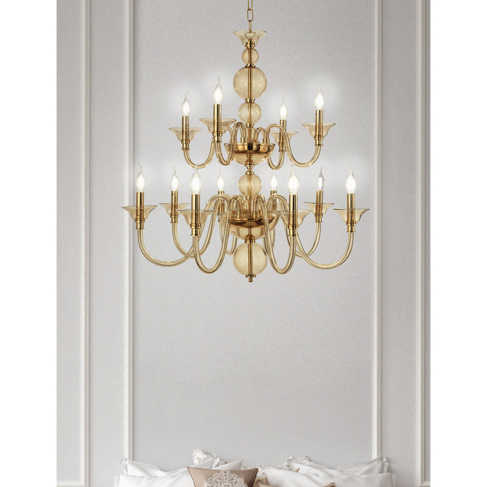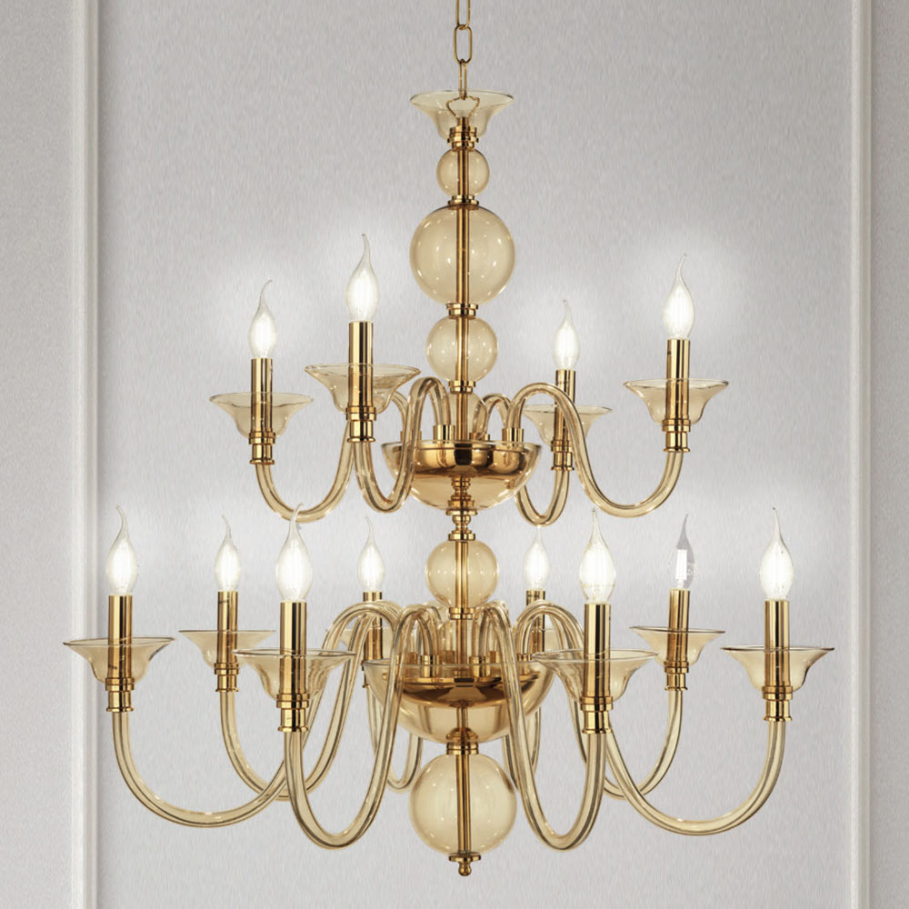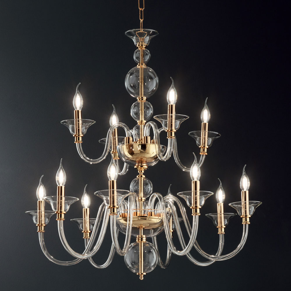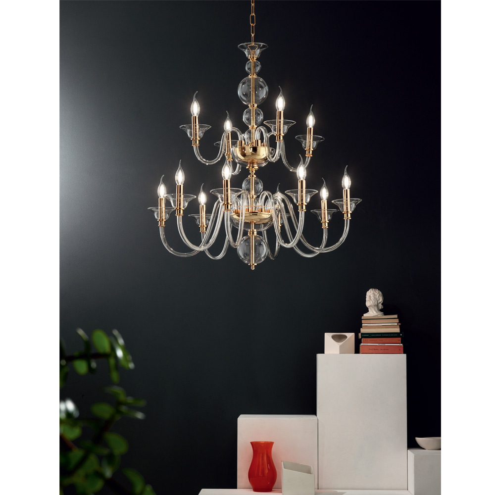 Klassisk 12-ljus ljuskrona i gyllene metall och handgjort glas, lyxig tillverkad i Italien.