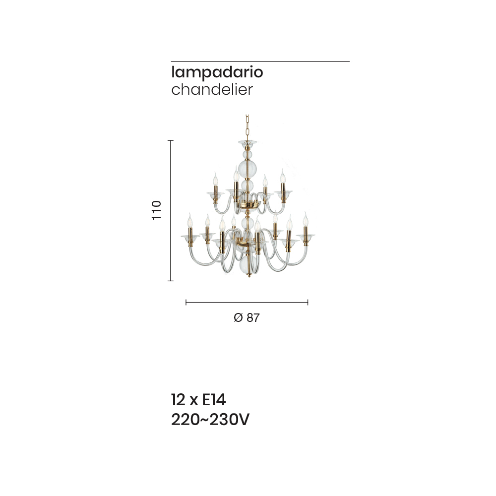klassiska och lyxiga design består av sfärer placerade ovanför varandra för ljuskroppen, som ger en glimt av den gyllene metallkärnan, och från 12 välvda armar , helt tillverkat av