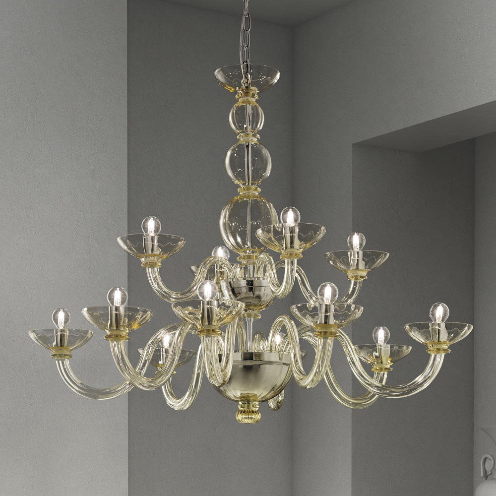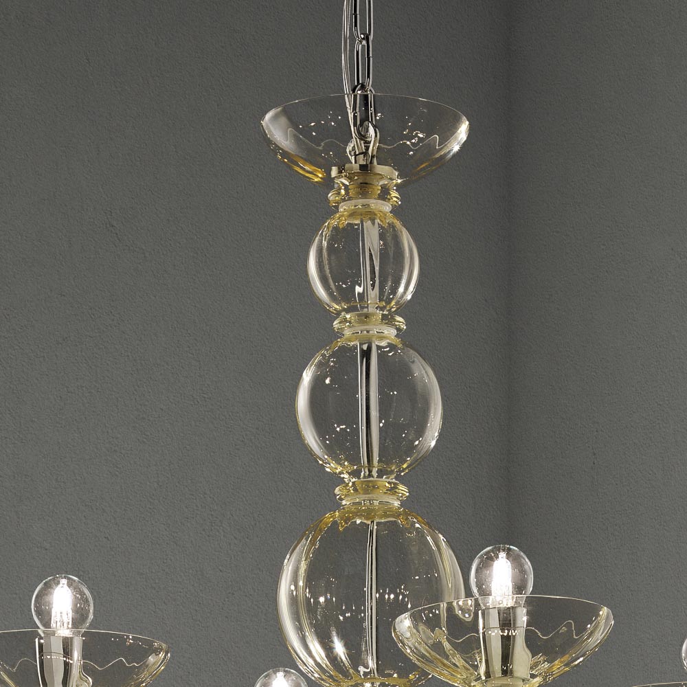 Ljuskrona med 12 lampor i Venedigglas, handarbetad topasfinish med detaljer i polerad kromad metall . En möbel med en fantastisk och ikonisk närvaro som kännetecknas av en mjuk och delikat linje och raffinerade kurvor som anpassar sig perfekt till klassiska miljöer men samtidigt också till utrymmen med en modern stil. Traditionselementet präglas av sina fantastiska komponenter i helt handgjort blåst glas som förvandlas för att uppdatera sig själv tack vare trendiga färger. Dess omslutande former gör den till ett idealiskt element för att ockupera alla miljöer, både hemmet och kontraktet, med klass och dynamik .