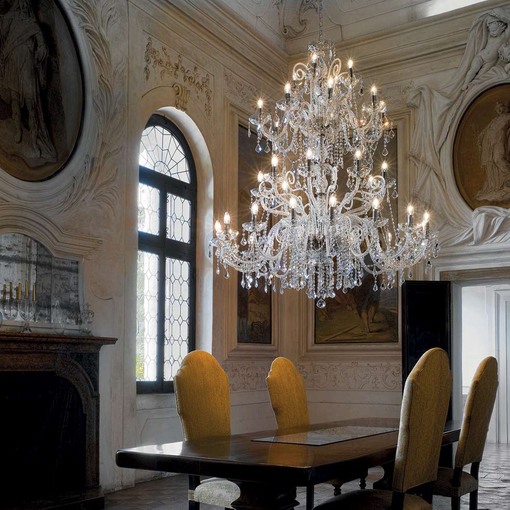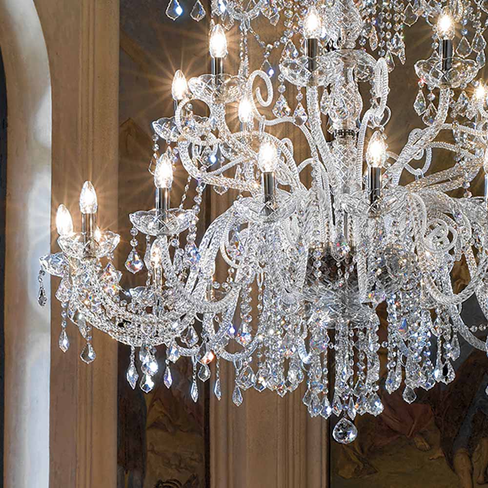 36-ljus ljuskrona av kristallfinat venetianskt glas med handarbetade blyhängen och detaljer i polerad kromad metall . Tillverkad genom ett hantverk , kännetecknas detta komplement av de underbara armarna arbetade för hand genom vridningstekniken som skapar ett exklusivt resultat som estetiskt påminner om sammanflätningen av ett rep, vilket ger personlighet till ljuskronan. Ett riktigt ljusregn invaderar ljuskronans struktur och sprider sig sedan till den omgivande miljön genom brytning genom magin med paljetter och kristallhängen med fina ytbehandlingar, vilket skapar en suggestiv och drömlik scenografisk effekt som kan förtrolla och överraska. för dess elegans och majestät .