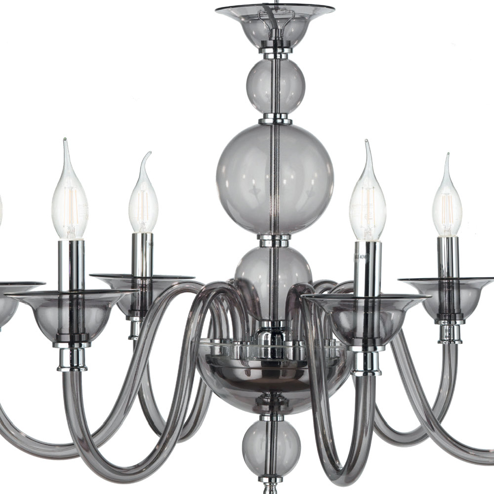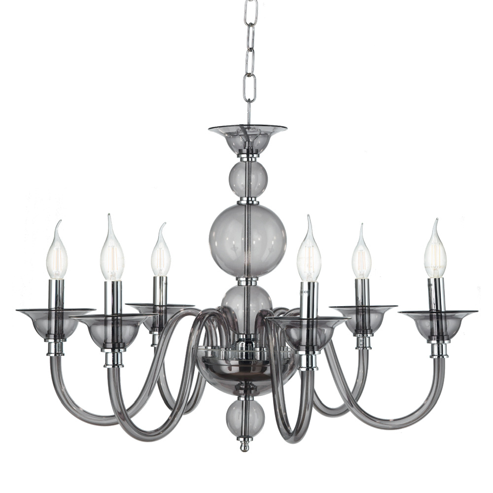 Klassisk 6-ljus ljuskrona i krommetall och handgjort rökt glas, tillverkad i Italien.