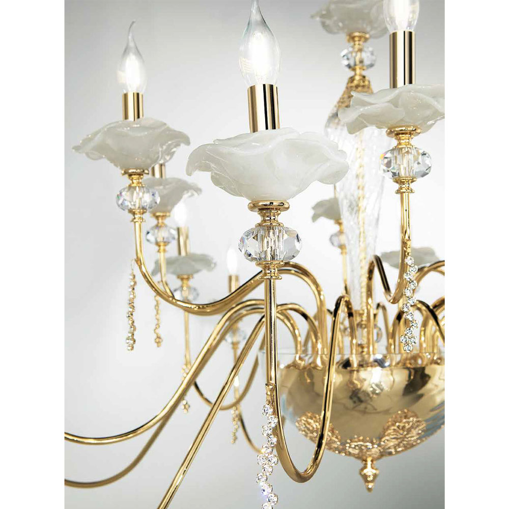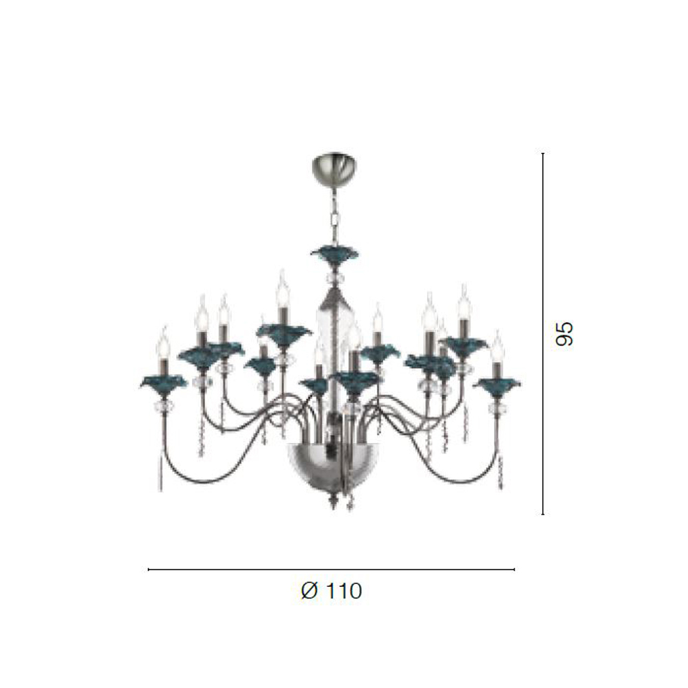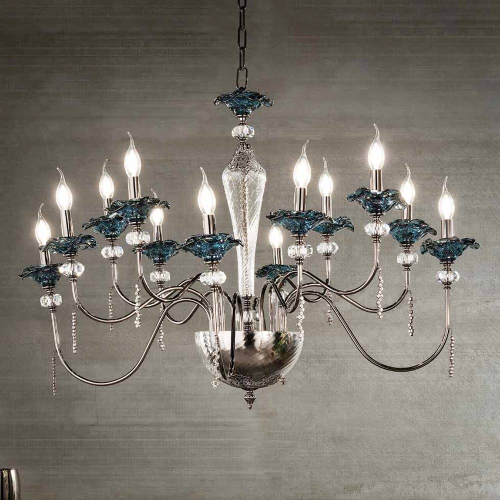 12 ljus ljuskrona i handgjort glas med knoppar och kristalldroppar, lyxig tillverkad i Italien.