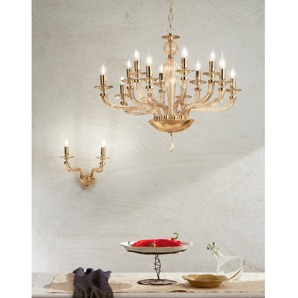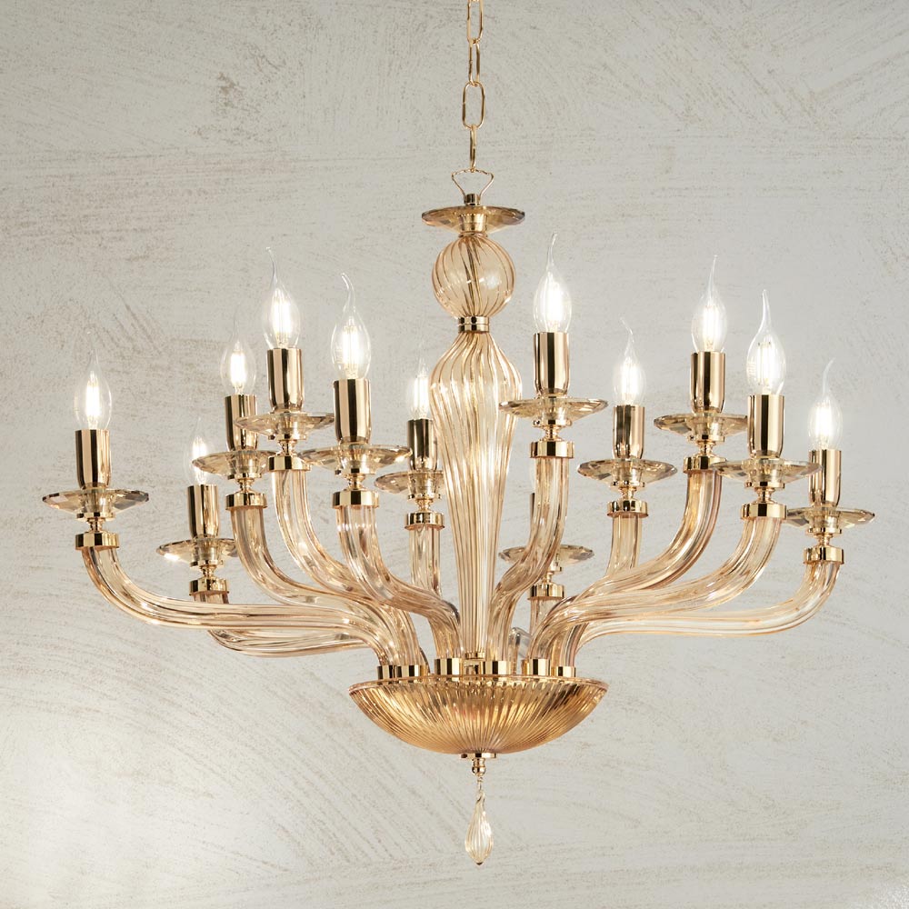 Denna hängande ljuskrona i klassisk stil består av 12 böjda armar gjorda av glas handgjorda i Italien med en "rigaton"-effekt i bärnstensfärgad finish som stödjer faten som är värd för ljuskällorna.