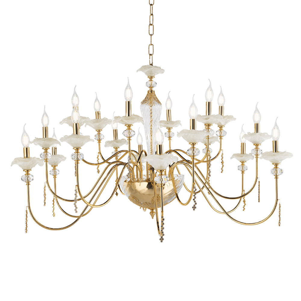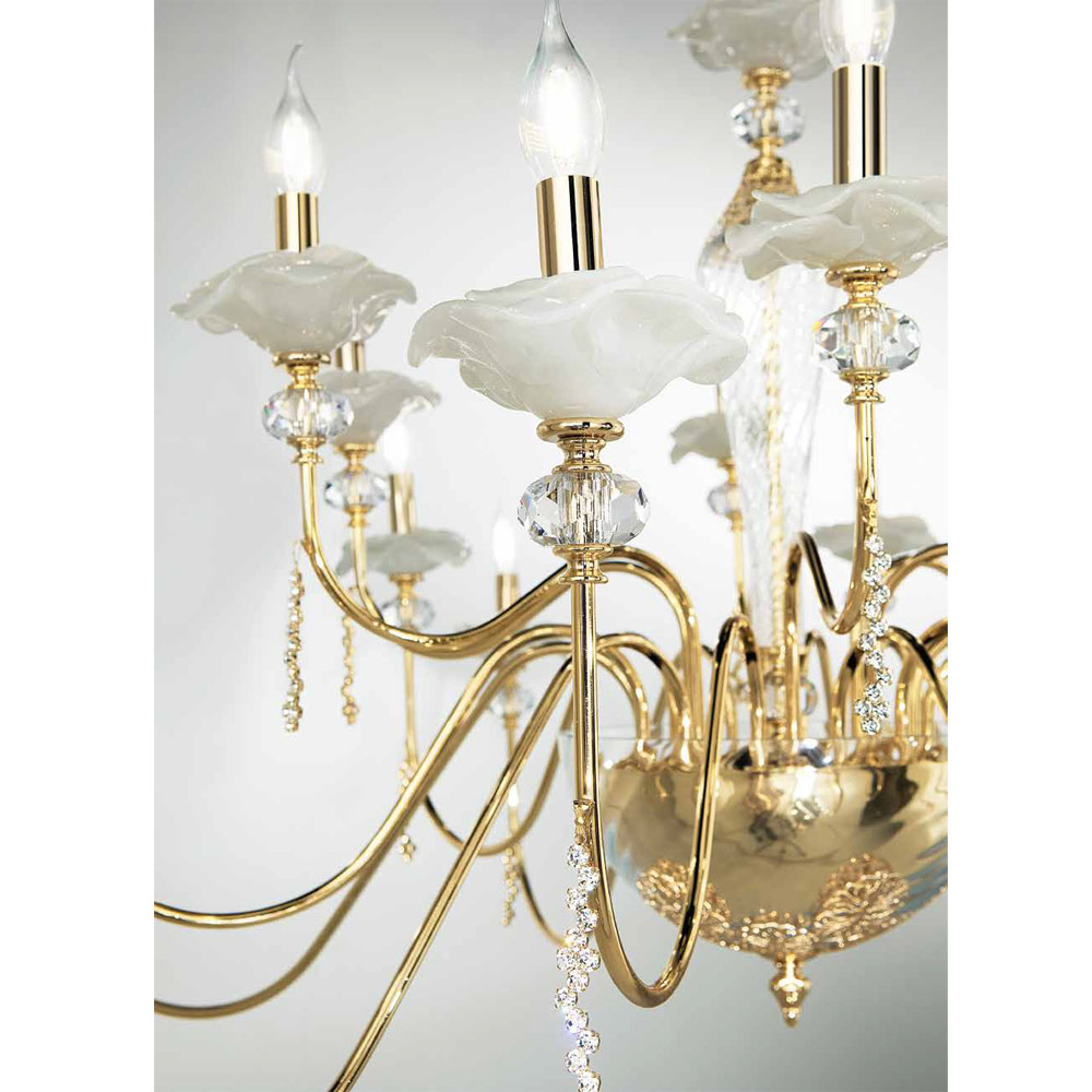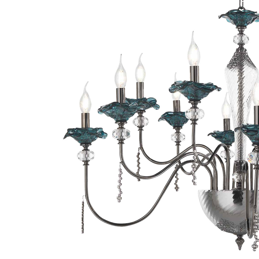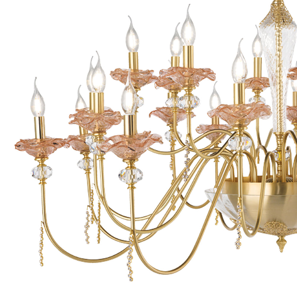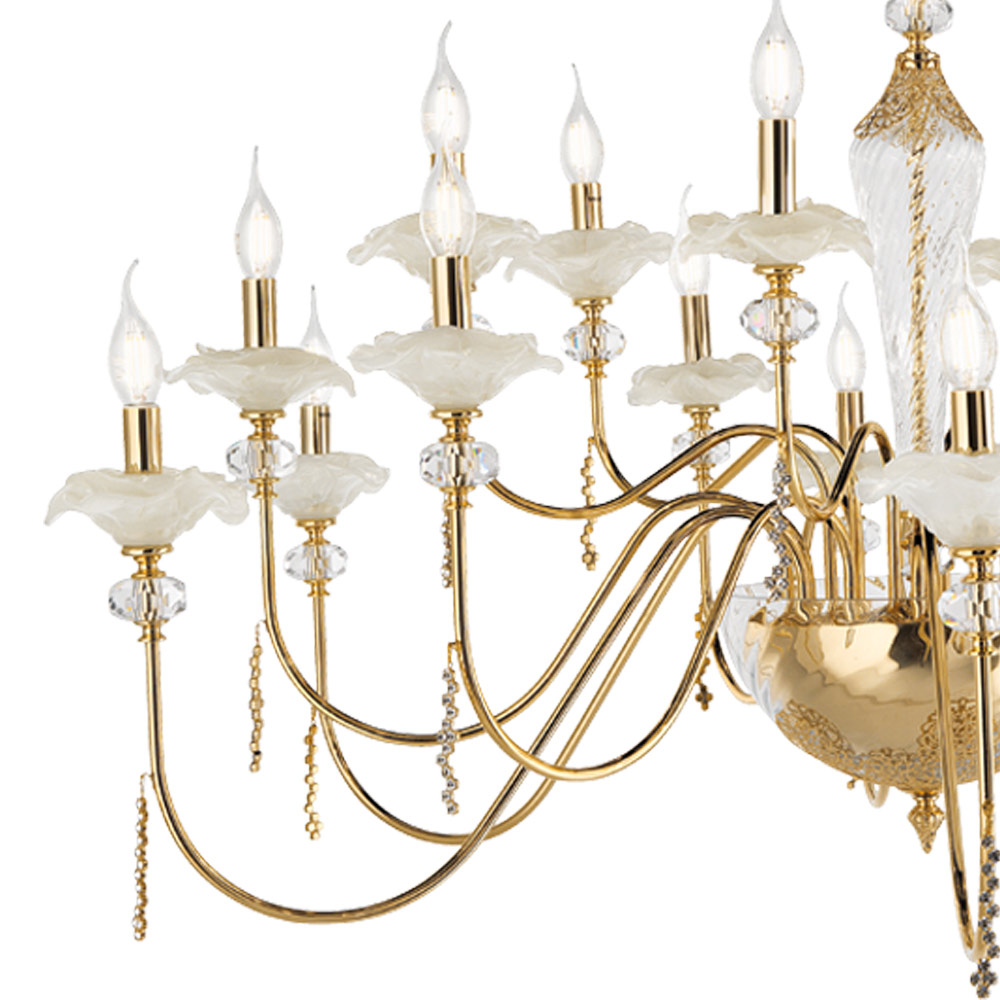18 ljus ljuskrona i handgjort glas med knoppar och kristalldroppar, lyxtillverkad i Italien.