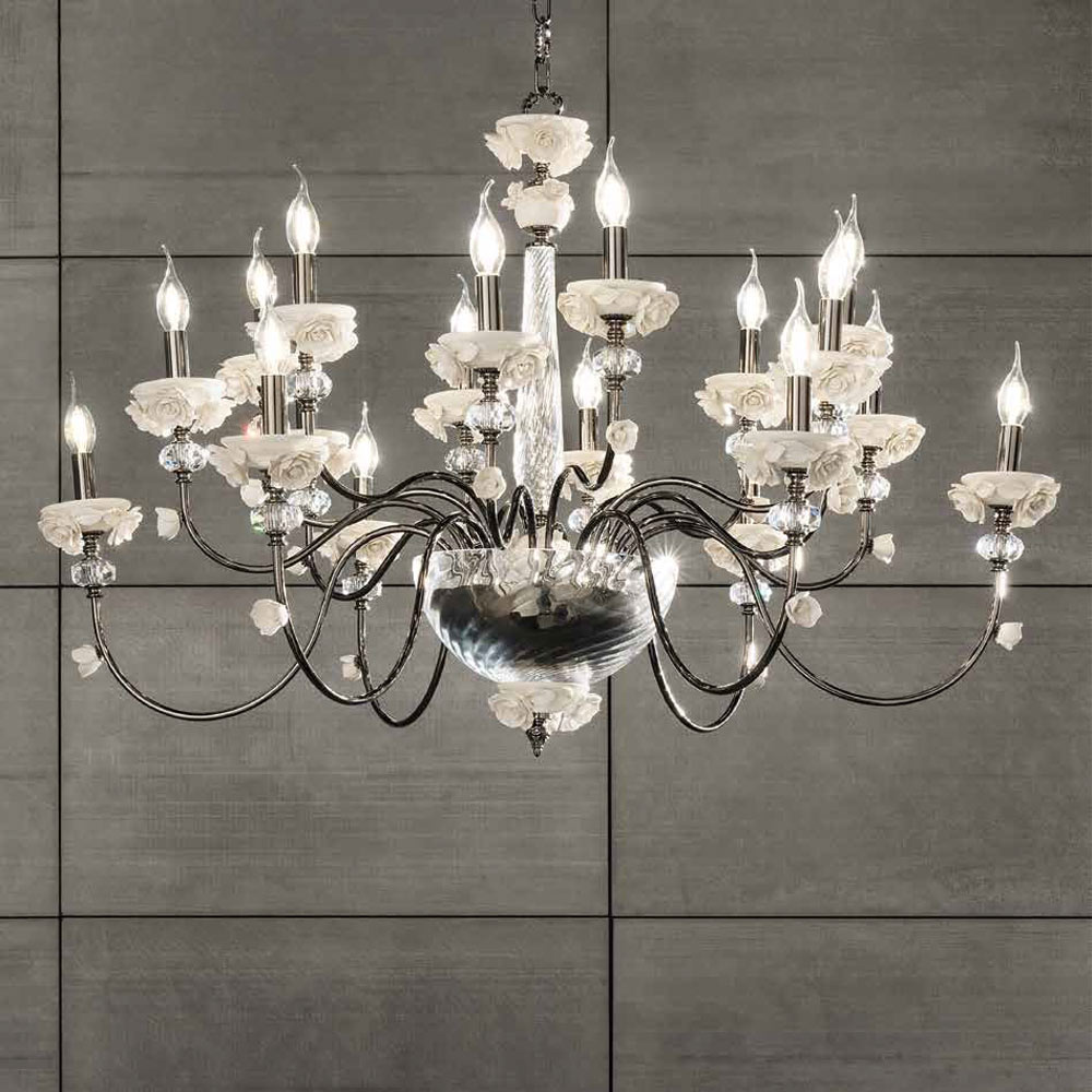 18 ljus ljuskrona i porslin och blåst glas, lyxig tillverkad i Italien.