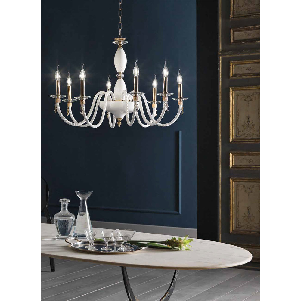 8 ljus ljuskrona i blåst glas och juveldetaljer, italiensk lyx.
