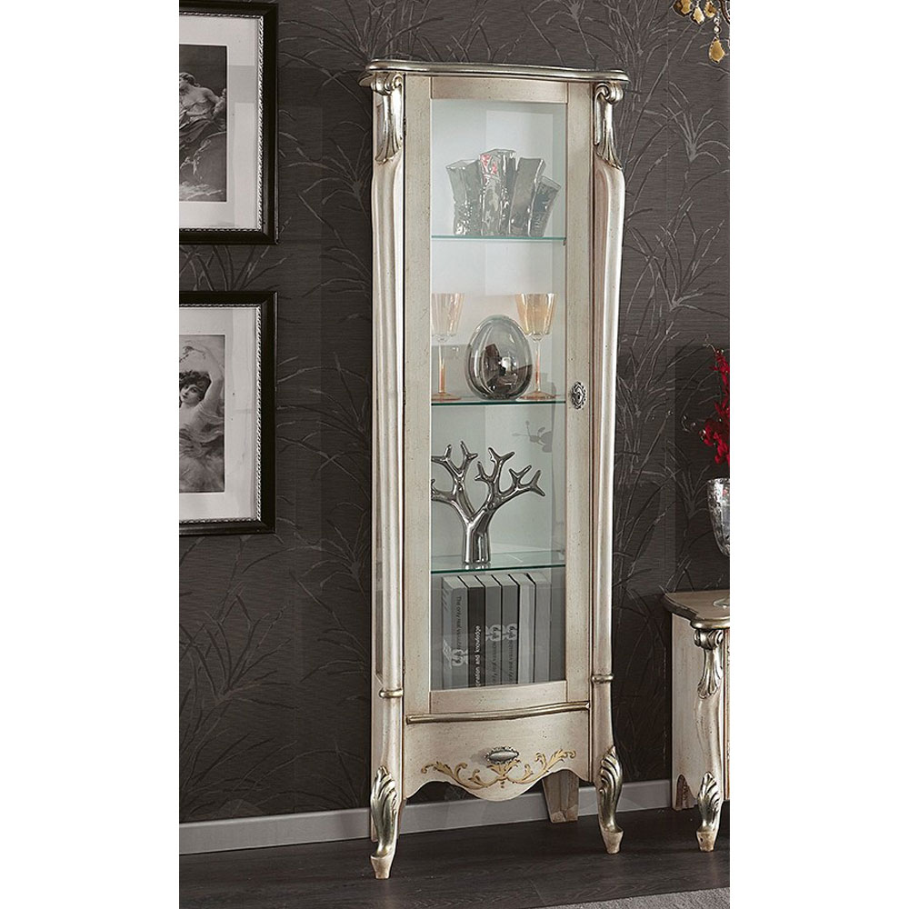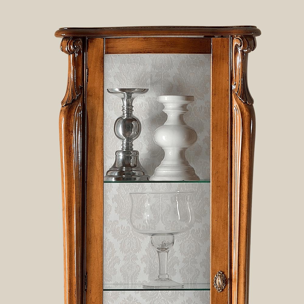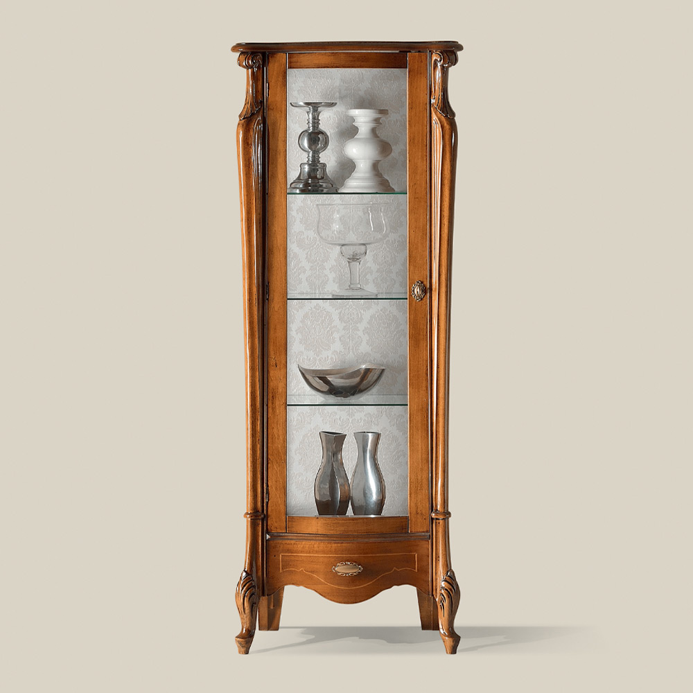 utställningsmonter i klassisk stil är perfekt för att inreda ett vardagsrum med stil och elegans. Den är gjord av trä i Bassano valnöt eller antikvit finish, och har en dörr och en praktisk låda. Det går även att välja mellan versionen med luckan som kan öppnas till höger eller till vänster.