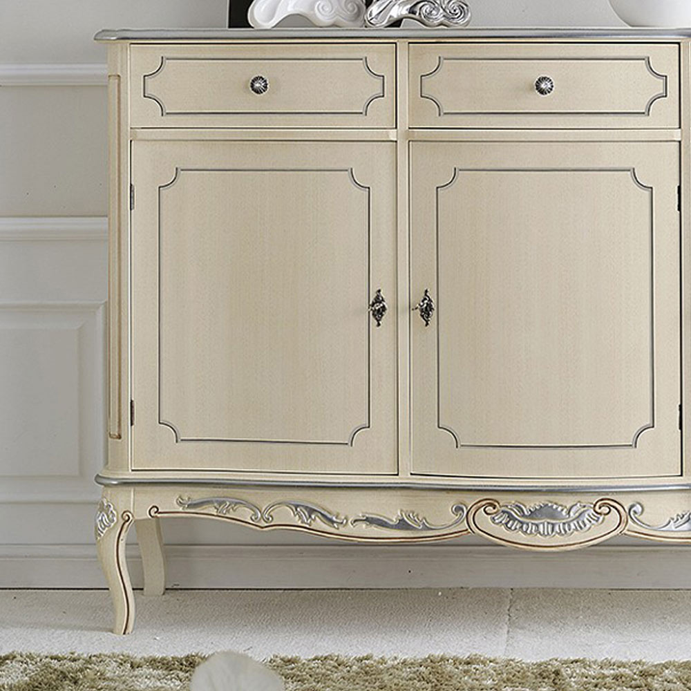 vitt med silverdetaljer. Skänken har tre lådor och tre luckor.