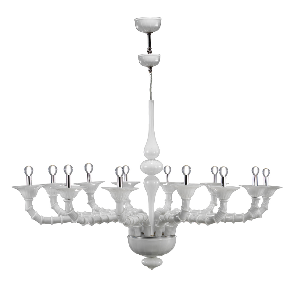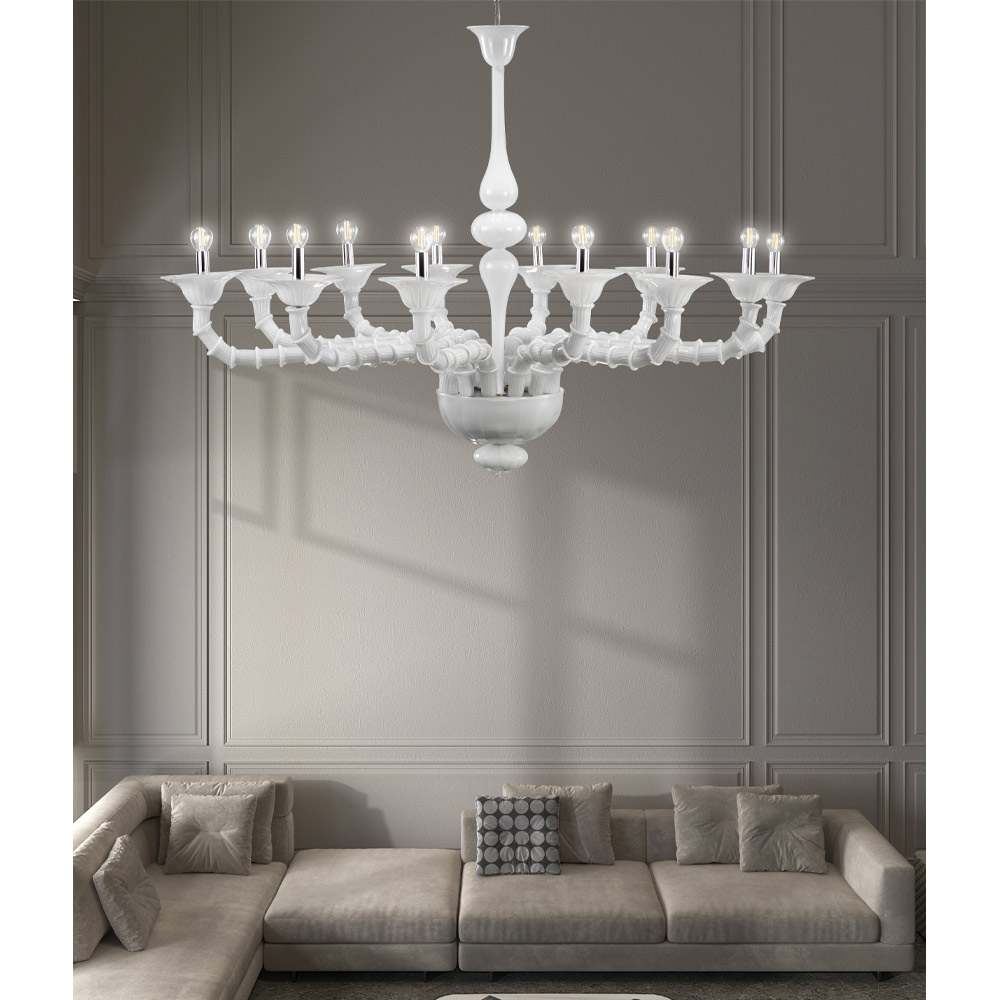 Ett konstverk som kännetecknas av en triumf av värdefulla detaljer gjorda av handblåst vitt Rezzonico-glas designat för att komplettera stora delar av huset som matsalar eller vardagsrum, vilket ger liv åt högkvalitativ belysning med en spännande personlighet. Armarnas längd är möjlig tack vare den speciella teknik som definieras som "bossole" som består i att montera flera glasdelar tillsammans vilket ger bevis på stort hantverk .
