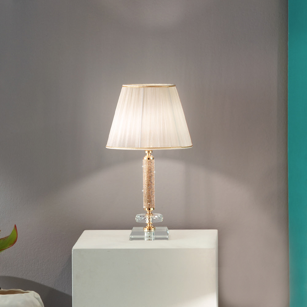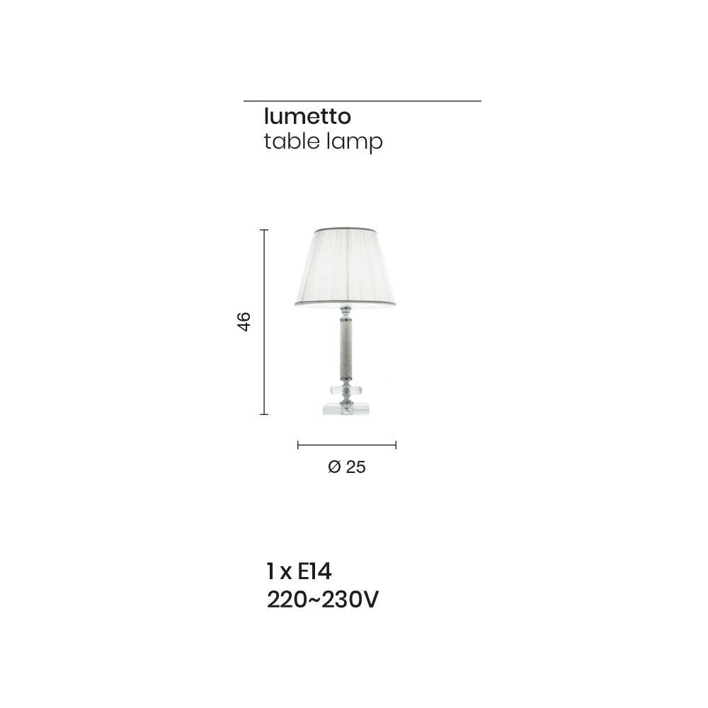 Designen avslutas med en lampskärm i plisserat tyg som säkerställer en mjuk och genomsyrad belysning; perfekt både för sängbord i sovrummet och för skrivbordet på ett kontor eller vardagsrum med en klassisk och elegant stil.