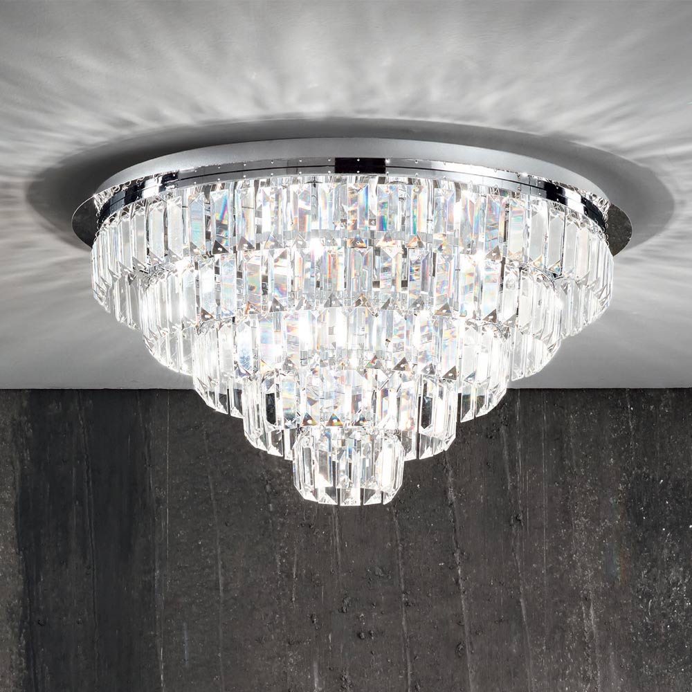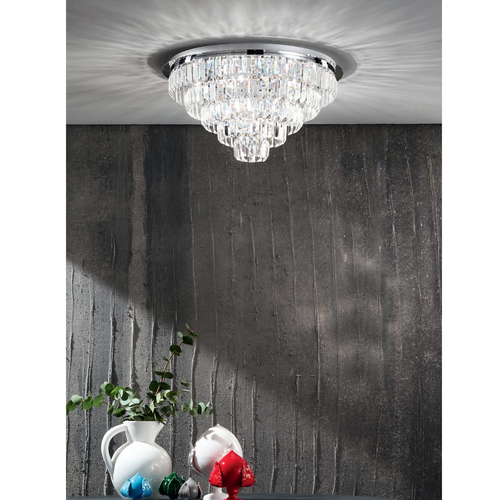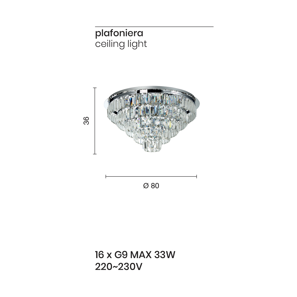Den består av en silvermetallstruktur och kristallhängen som dekorerar , lyser upp alla miljöer med smak och karaktär, i en blandning av stil, klass och innovation.