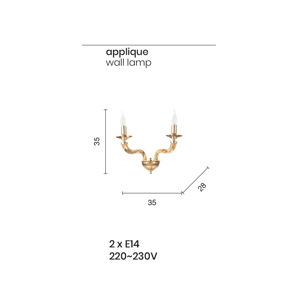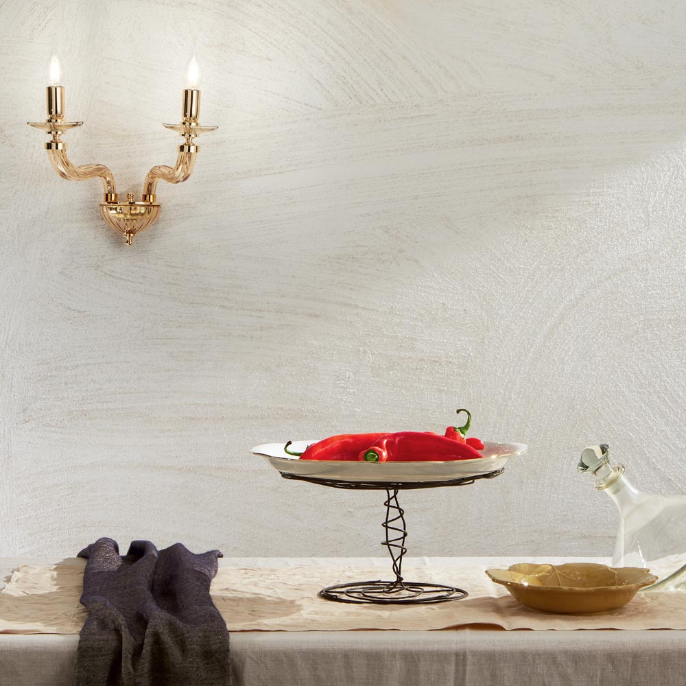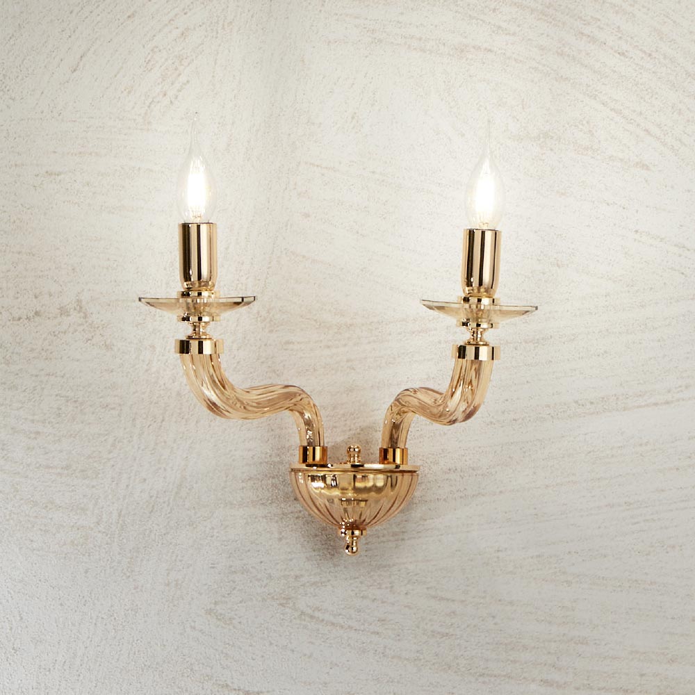 Denna klassiska väggljuskrona består av 2 böjda armar gjorda av glas handgjorda i Italien med en "rigaton"-effekt i den bärnstensfärgade finishen som stödjer faten som är värd för ljuskällorna.
