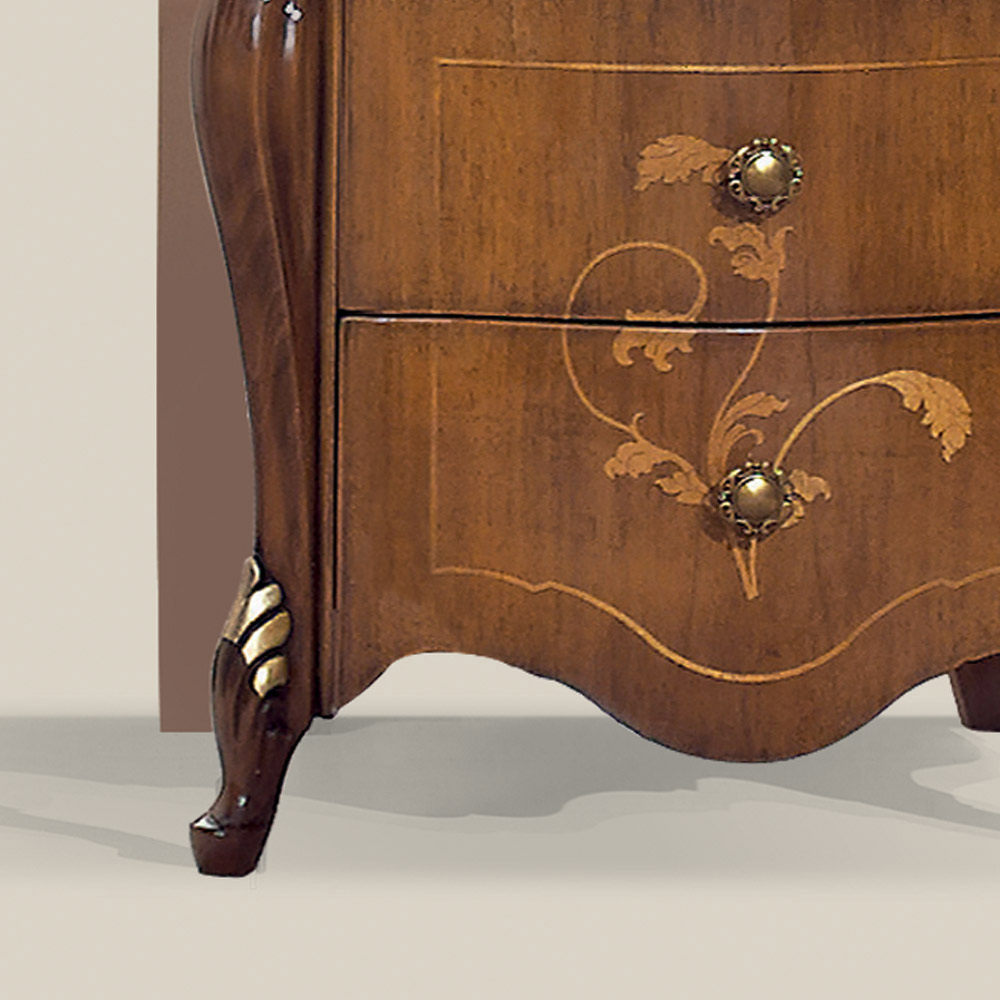 Sängbord för sovrum av Bassano valnöt och antikguld med eleganta inlägg och 3 praktiska lådor. Ett unikt och raffinerat komplement, helt tillverkat i Italien av skickliga hantverksmästare , konstmästare som avslutar varje komplement med visdom och smak för elegans. Produktionen utförs med fina material och utför arbetet för hand med största omsorg och professionalism som utmärker Made in Italy -produkter.