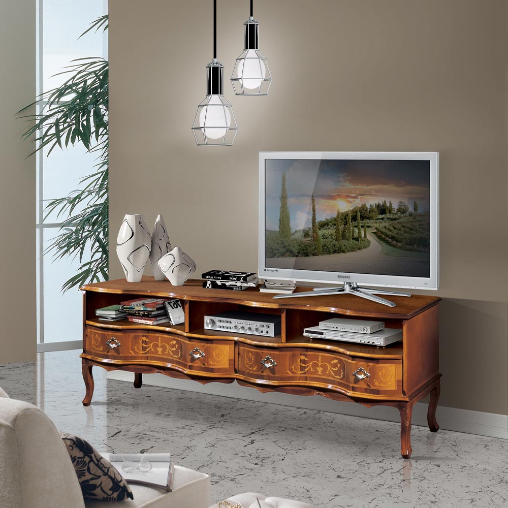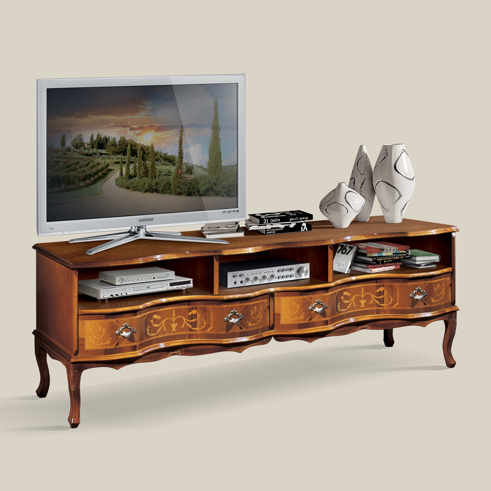 TV-bänk i trä i klassisk stil med fack och lådor, tillverkad i Italien.