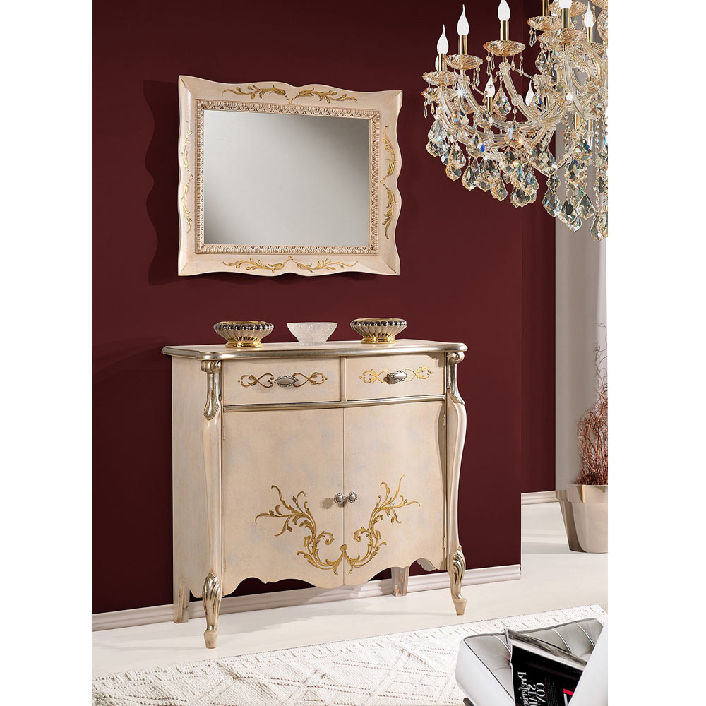 Vardagsrumsskänk med klassisk och elegant stil komplett med 2 luckor och 2 praktiska lådor, finns i Bassano valnöt och antikguld eller antikvit finish med inlägg. Ett unikt och raffinerat komplement, helt
