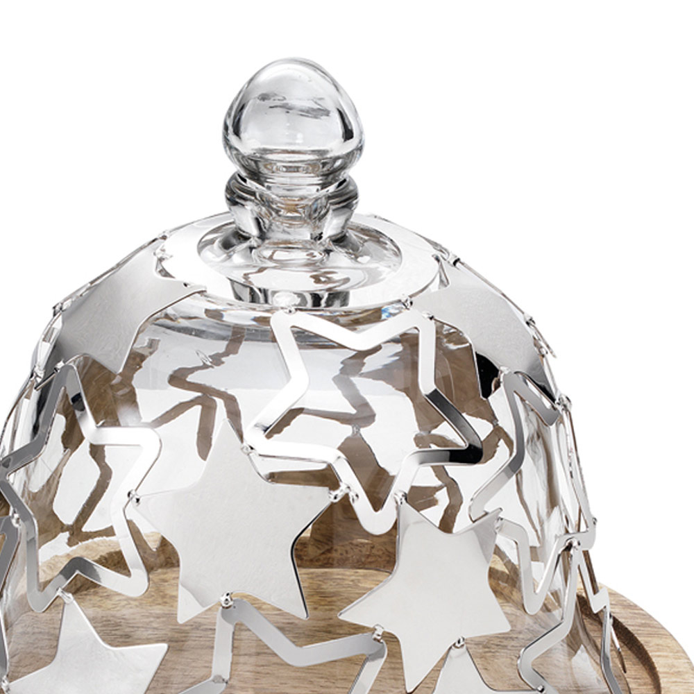 Denna kakhållare har en sofistikerad och elegant klockdesign , helt tillverkad med träbotten och glaslock med stjärnformade silvermetalldekorationer.