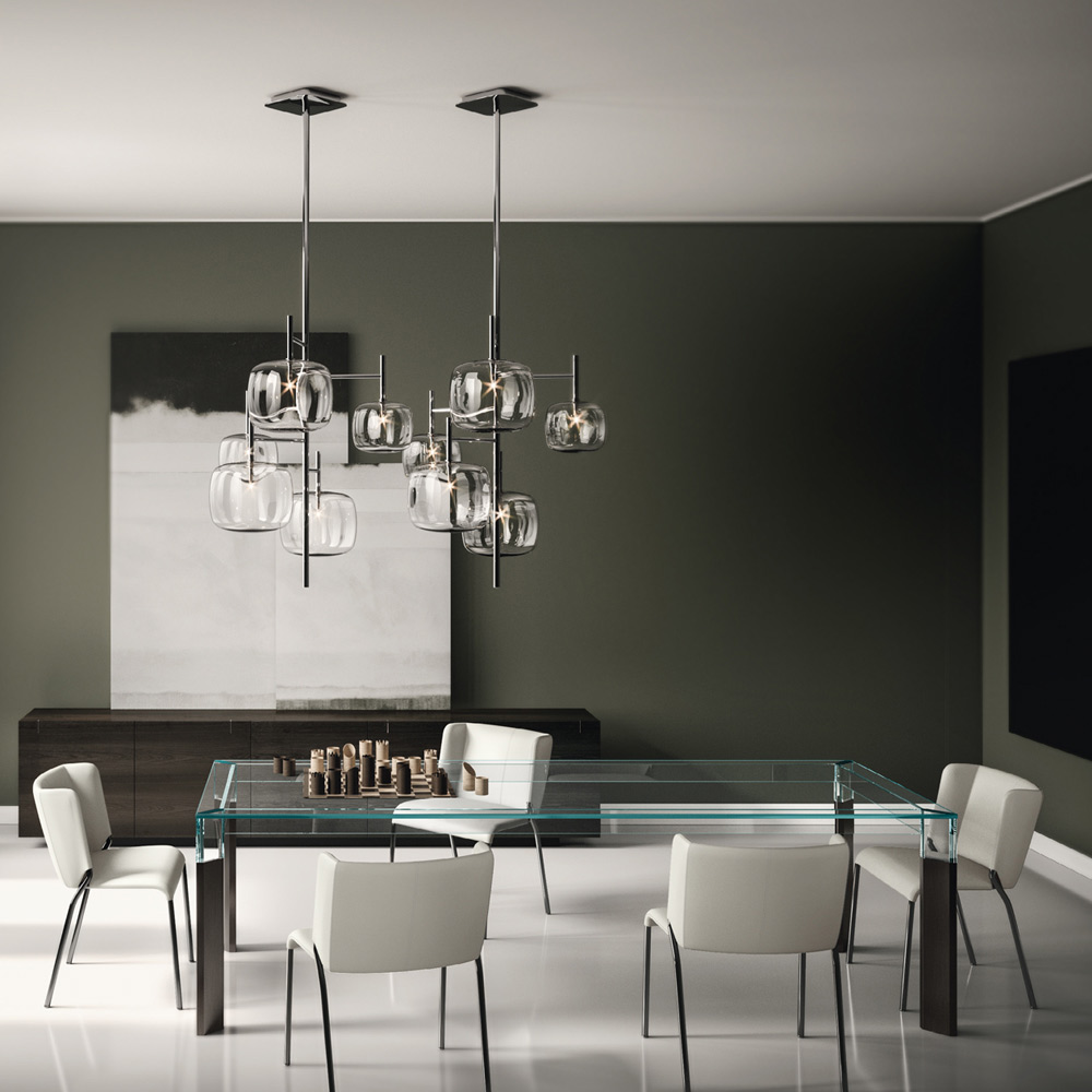 harmoni av enkla linjer och former som skapar den perfekta idén att inreda matsalar eller kök med en modern stil på ett exklusivt och raffinerat sätt, som erövrar uppmärksamhetens centrum och gör stunder i företaget unika.