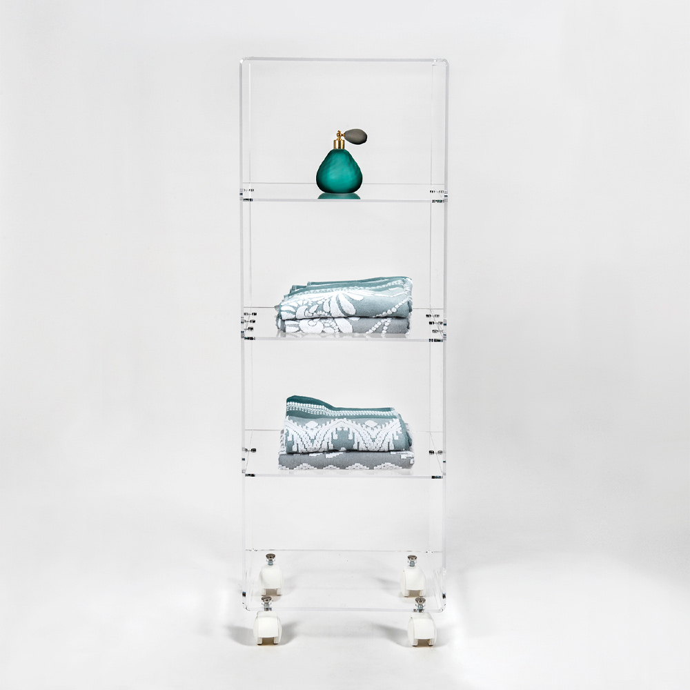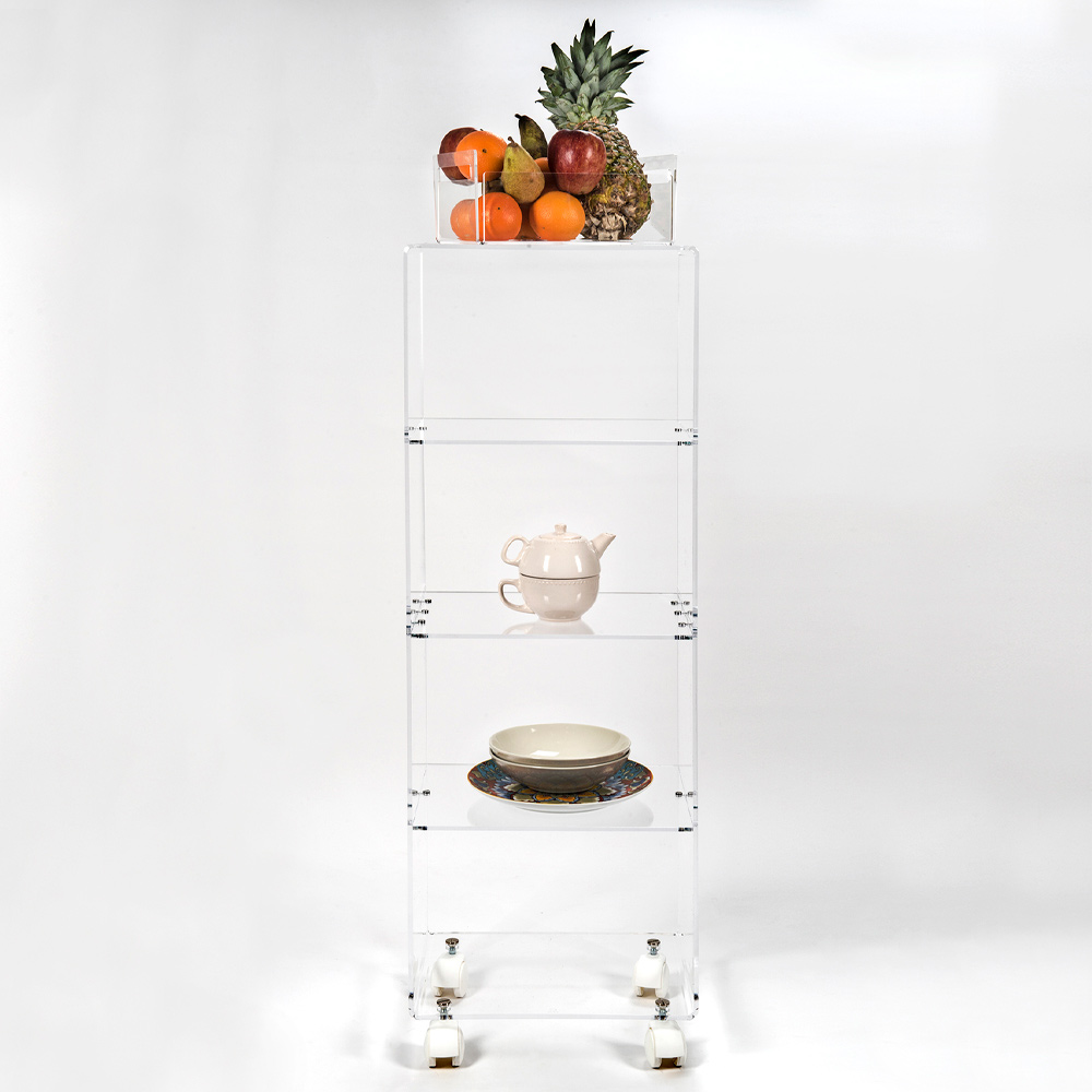 Varje hylla i denna vagn är en scen som förhöjer vad den innehåller, tack vare den kristallina transparensen hos förstahandsplexiglaset. Råmaterialet, 100 % jungfruligt polymerplexiglas , säkerställer en ljusstyrka och briljans som förblir oförändrad över tiden, ett engagemang för kvalitet som kan ses och kännas.