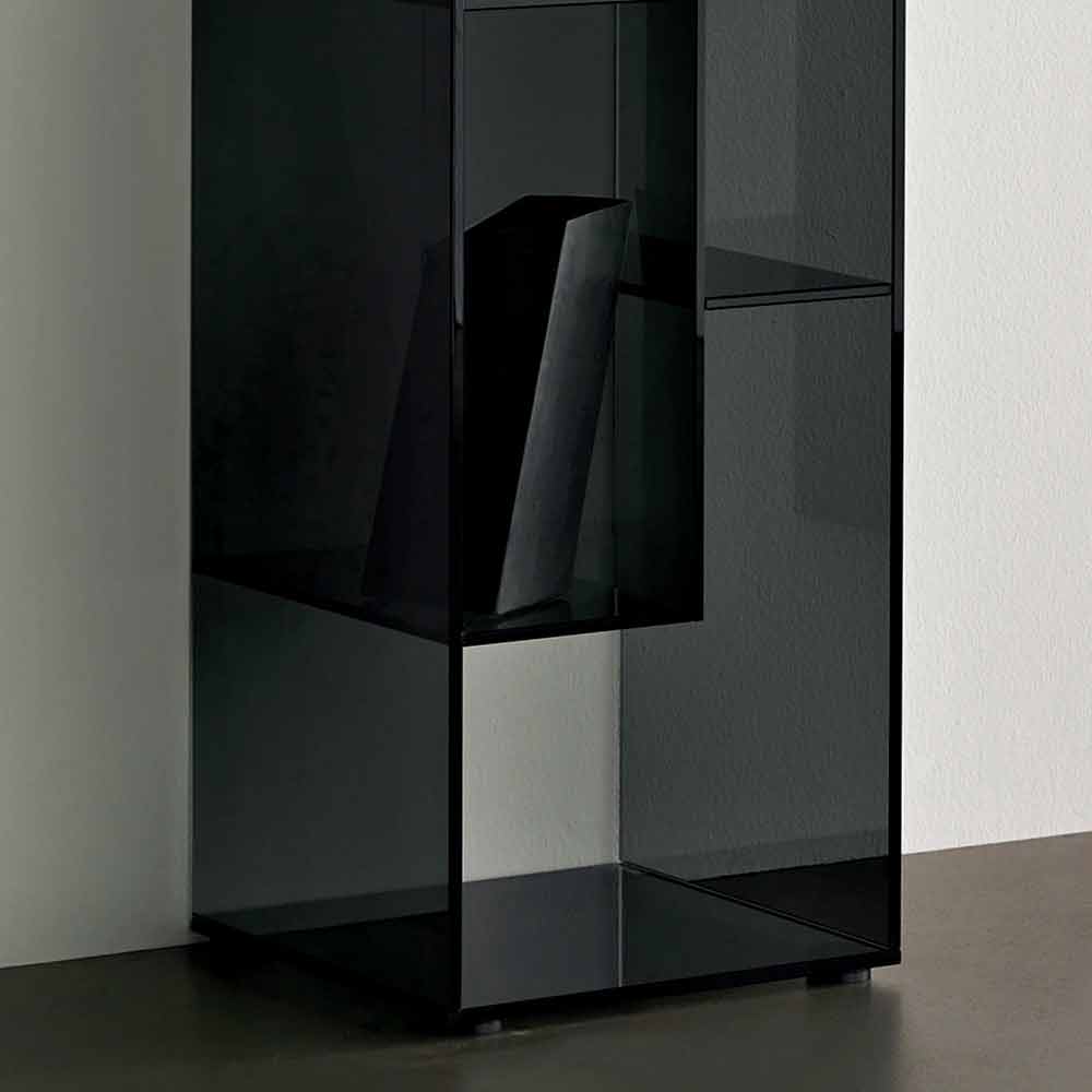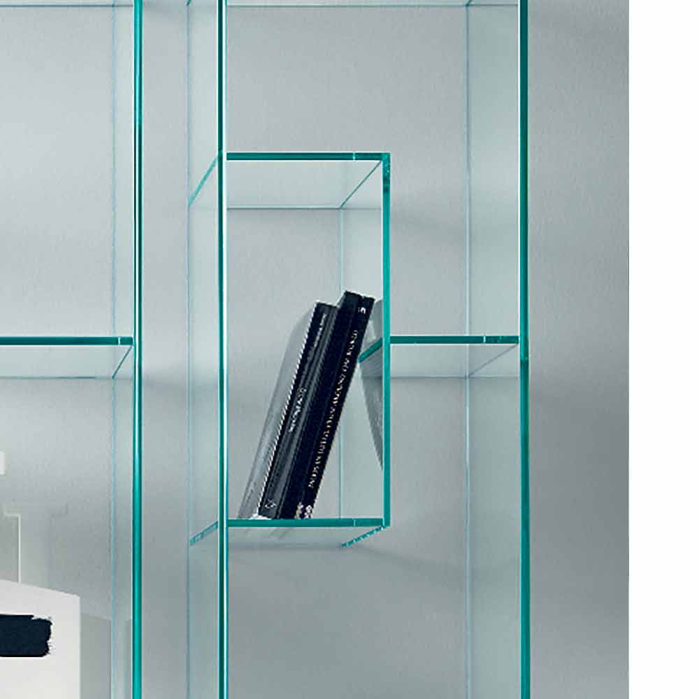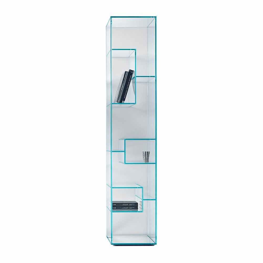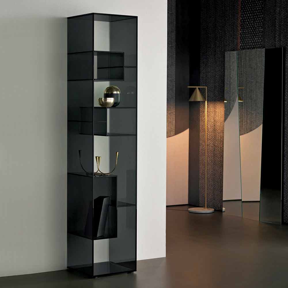 Denna bokhylla kännetecknas av sin beslutsamma och eleganta design helt och hållet i extra klart eller rökt glas.