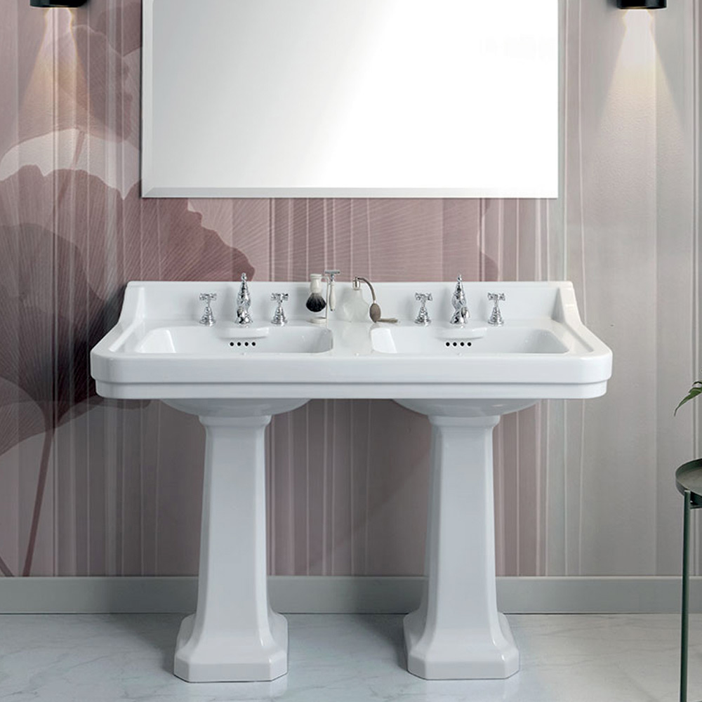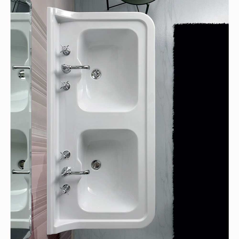 Konsoltvättställ med dubbla handfat av blank vit keramik genom en 100% tillverkad hantverkare tillverkad i Italien . En möbel som väcker liv i klassiska mönster från förr för att möblera lika klassiska badrumsområden med karaktär men också moderna miljöer där man kan spela på originella och aldrig tidigare skådade stilkontraster .