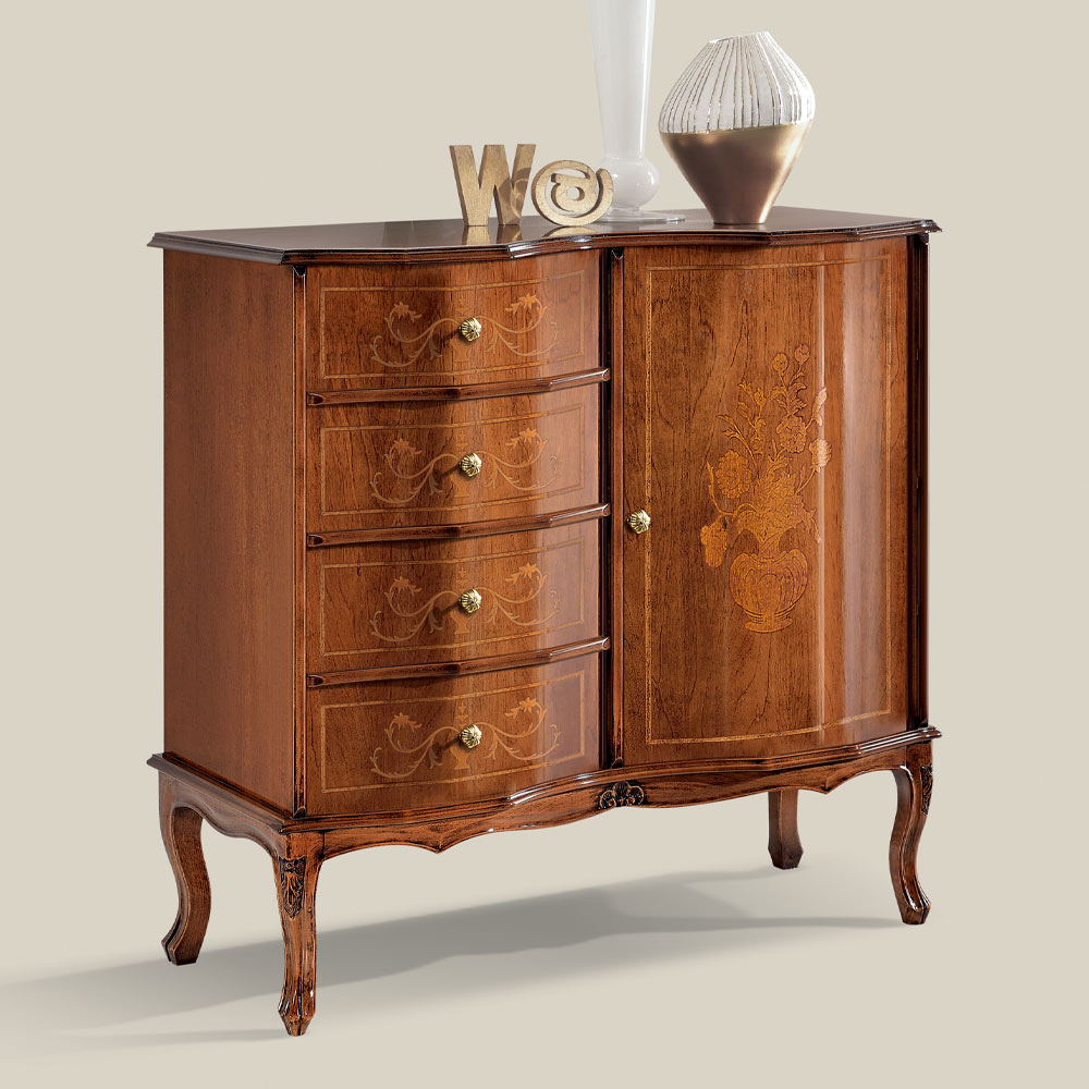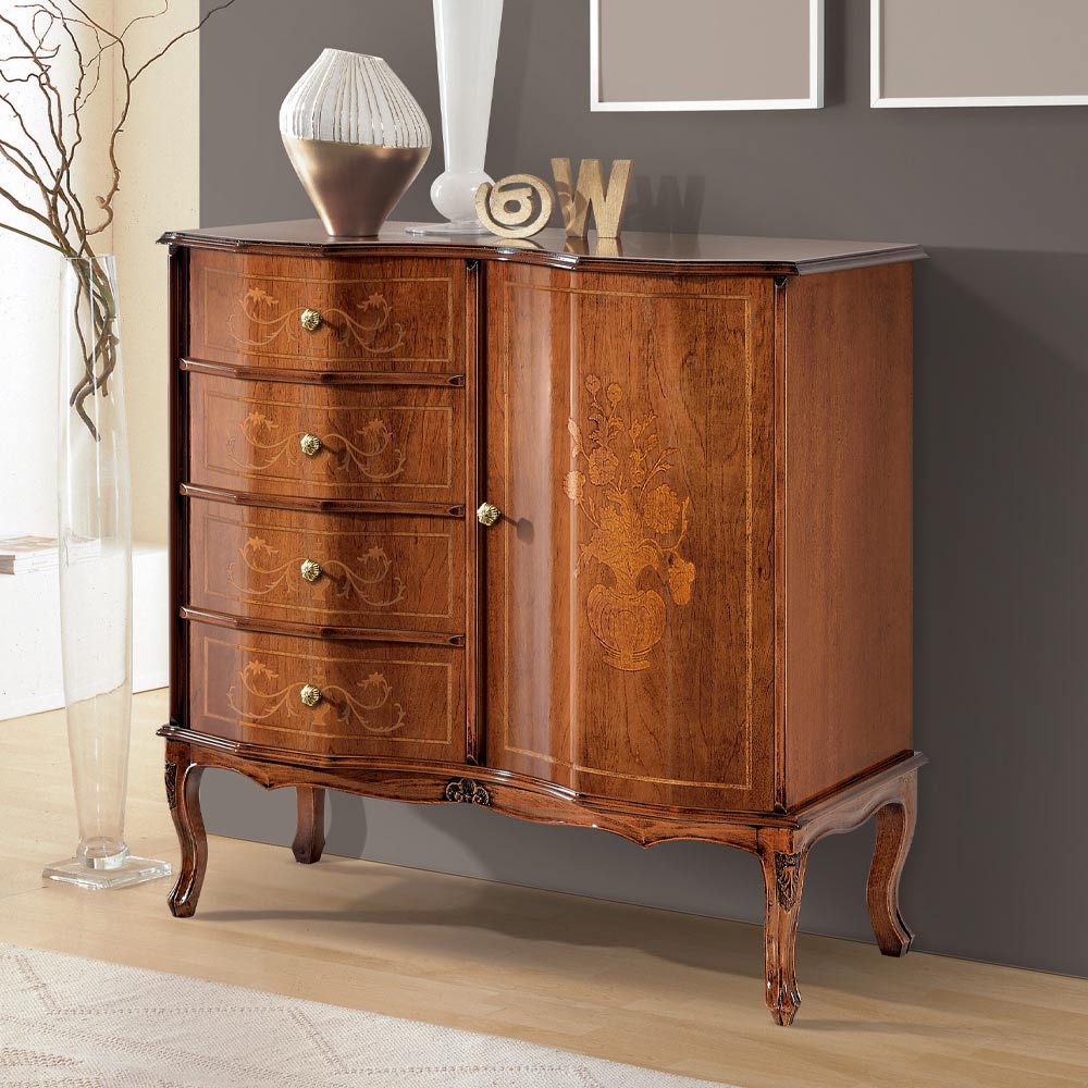 Kommod med en lucka och fyra lådor i klassisk och elegant stil . Tillverkad av värdefullt polerat valnötsträ med gyllene inlägg som gör det till ett raffinerat komplement som kan försköna miljön där den är placerad. Helt tillverkad i Italien och handgjord av skickliga hantverkare , färdig med visdom och smak för elegans. Produktionen utförs med fina material och utför arbetet för hand med största omsorg och professionalism som utmärker Made in Italy -produkter.