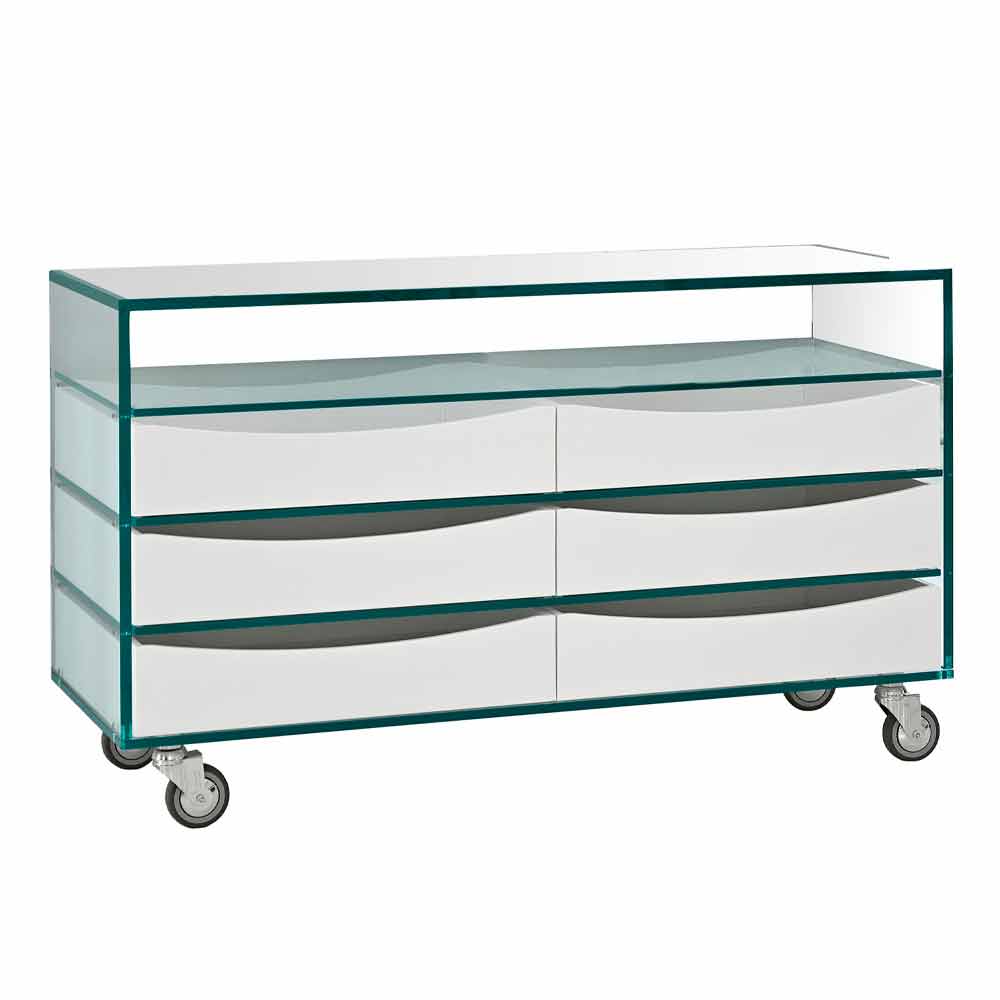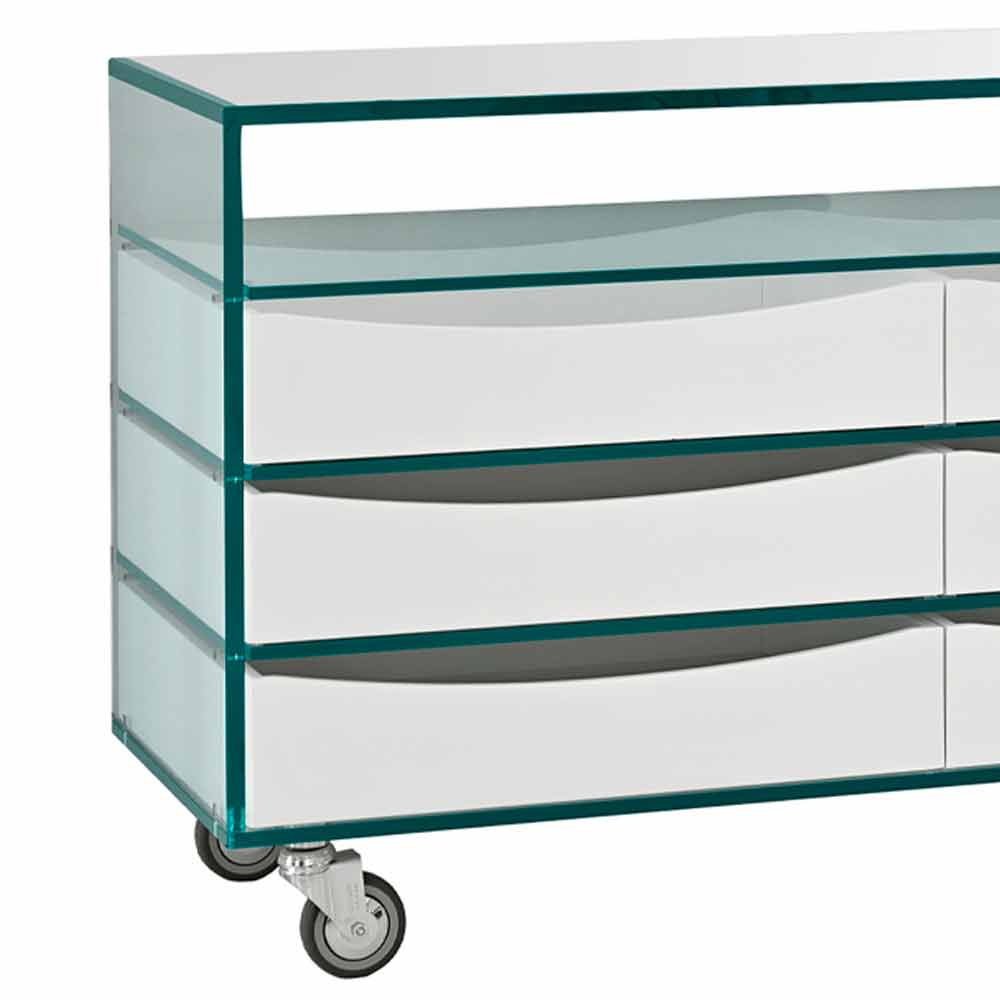 Skåp i modern stil på hjul i extraklart glas med sex lådor i vitt trä, realiserat i Italien för hand.