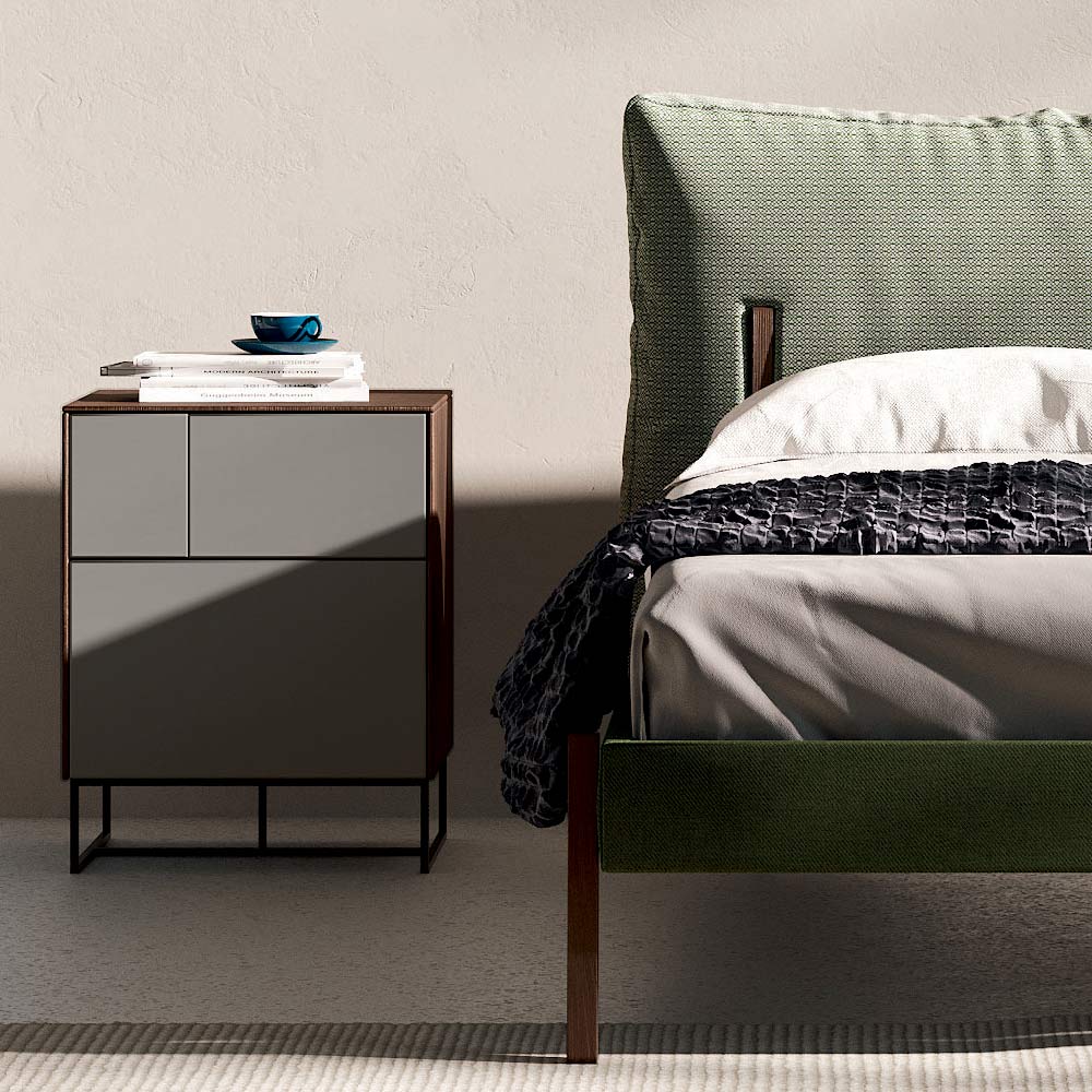polerade metallbasen. En möbelidé som kommer från en noggrann studie av proportioner och storlekar för att skapa en lösning som understryks av starka kontraster mellan former och material. Sängen kännetecknas av trädetaljer som berikar figuren, vilket gör den original och särskilt modern och av de två stora och